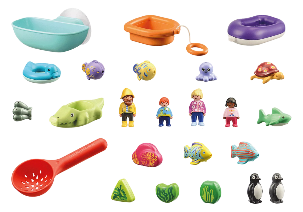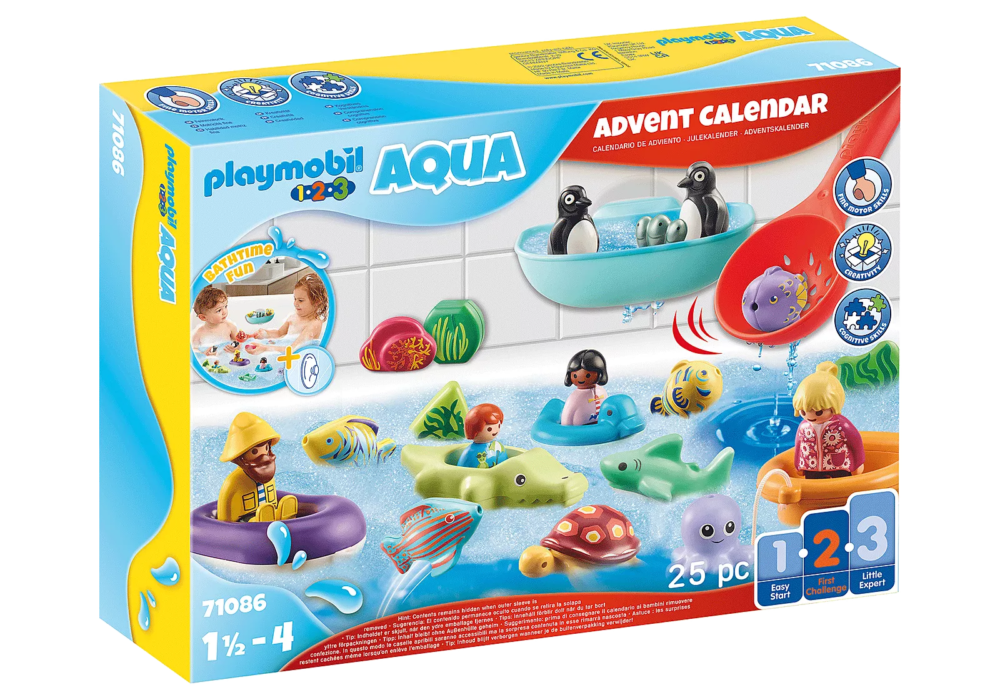 ปฏิทินจุติของ PLAYMOBIL 1.2.3 AQUA นำเสนอการเตรียมการที่ดีที่สุดสำหรับคริสต์มาสและความสนุกสุดเหวี่ยงสำหรับเจ้าตัวน้อย ฟิกเกอร์และสัตว์ต่างๆ ของ PLAYMOBIL 1.2.3 สีสันสดใสถูกซ่อนอยู่หลังประตู 24 ประตูในช่วงก่อนคริสต์มาสที่น่าตื่นเต้น ด้วยผลิตภัณฑ์ PLAYMOBIL 1.2.3 AQUA ที่ออกแบบมาเป็นพิเศษ จึงมีความสนุกสูงสุดในอ่างอาบน้ำ ถาดรองน้ำหยดติดกับขอบอ่างอาบน้ำหรือกระเบื้องโดยใช้ถ้วยดูด องค์ประกอบการทำงานทั้งหมดได้รับการออกแบบด้วยสีแดงเพื่อให้สามารถค้นพบเอฟเฟกต์พิเศษของเกมได้ทันที โลกแห่งการเล่น PLAYMOBIL 1.2.3 AQUA ที่มีสีสันช่วยส่งเสริมทักษะการเคลื่อนไหวที่ดี ความคิดสร้างสรรค์ และความรู้ความเข้าใจเกี่ยวกับการเชื่อมต่อ ปฏิทินจุติประกอบด้วยฟิกเกอร์ PLAYMOBIL 1.2.3 สี่ตัว ตาข่ายลงจอด ฉลาม ปลาหมึกยักษ์ เต่า ปลาสี่ตัว