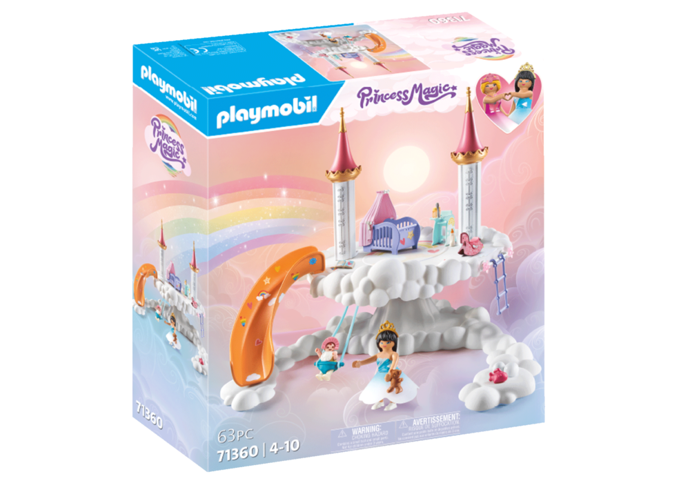 สัมผัสประสบการณ์สุดสนุกไปกับเบบี้คลาวด์จากสวรรค์จาก PLAYMOBIL เจ้าหญิงได้รับการคุ้มครองโดยสายรุ้งและแสงของดอกสีรุ้ง คอยดูแลความเป็นอยู่ที่ดีของสิ่งมีชีวิตทุกชนิด บนก้อนเมฆบนสวรรค์ ผู้อาศัยอยู่ในเมฆที่เล็กที่สุดได้รับการดูแลด้วยความรัก ด้วยเปลเด็ก ม้าโยก ตุ๊กตาหมี สไลเดอร์ และอาหารอร่อยๆ ทุกสิ่งมีไว้เพื่อให้คุณรู้สึกสบายอย่างแท้จริง เมื่อรวมกับปราสาทสายรุ้งสวรรค์ (71359) และชุดละครเมฆสวรรค์ (71408) ฉากสายรุ้งขนาดใหญ่สีสันสดใสก็ถูกสร้างขึ้น