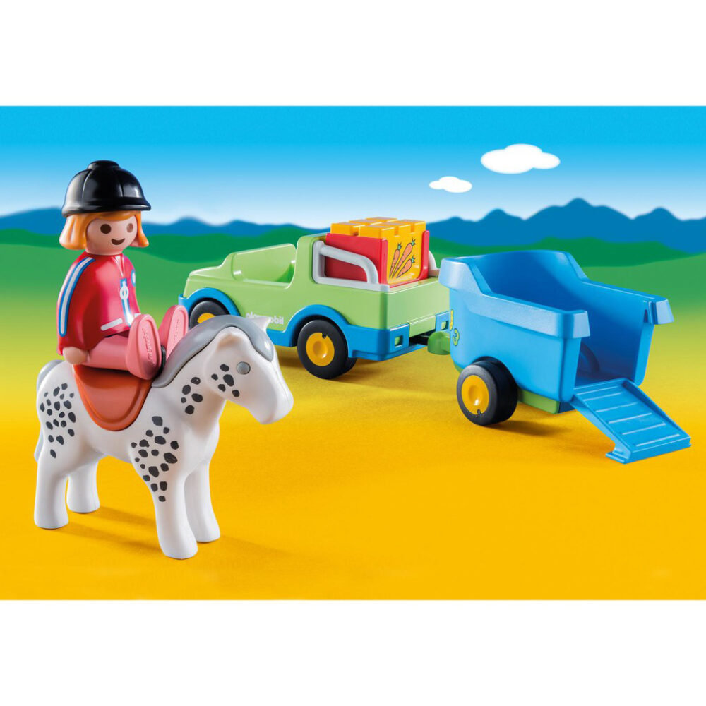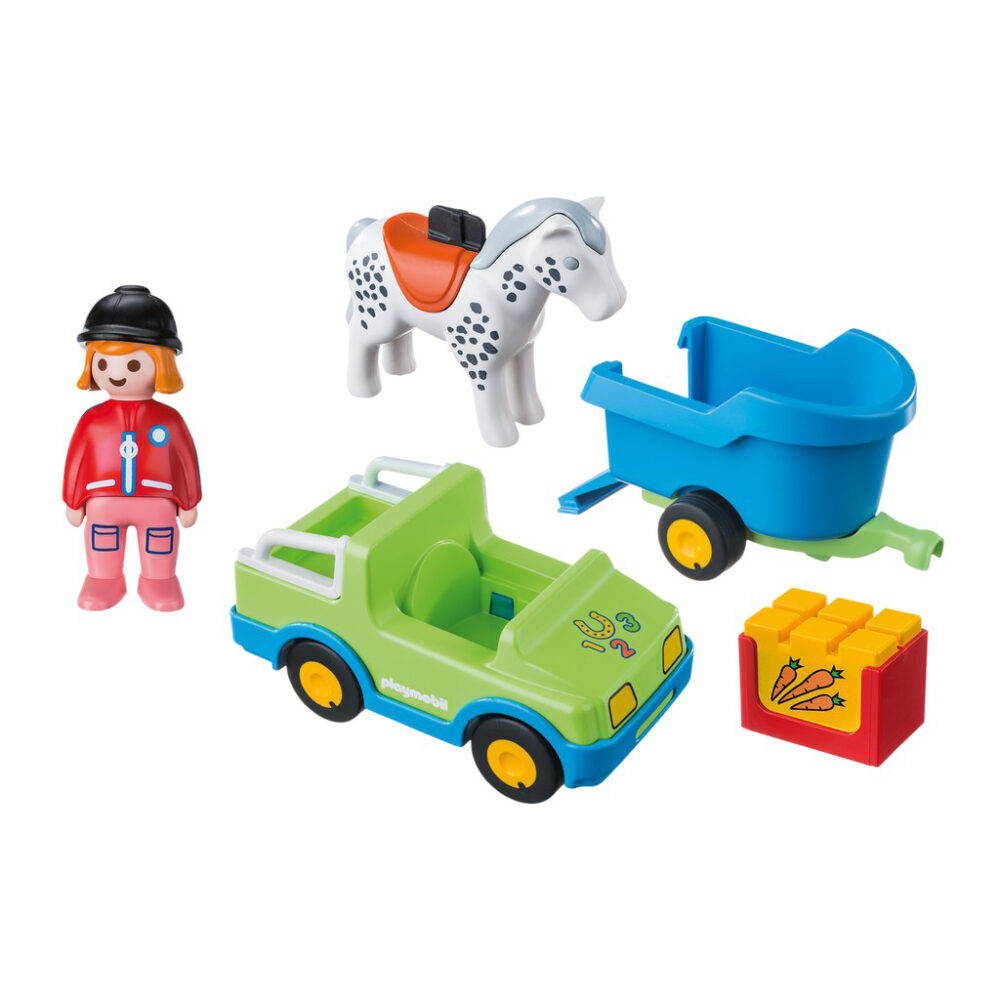 Playmobil Car with Horse Trailer เพลย์โมบิล รถ พร้อมรถพ่วงรถม้า (PM-6958) รหัสสินค้า: PM-6958 ม้าถูกนำไปตามทางลาดที่ใส่บานพับลงในรถพ่วง