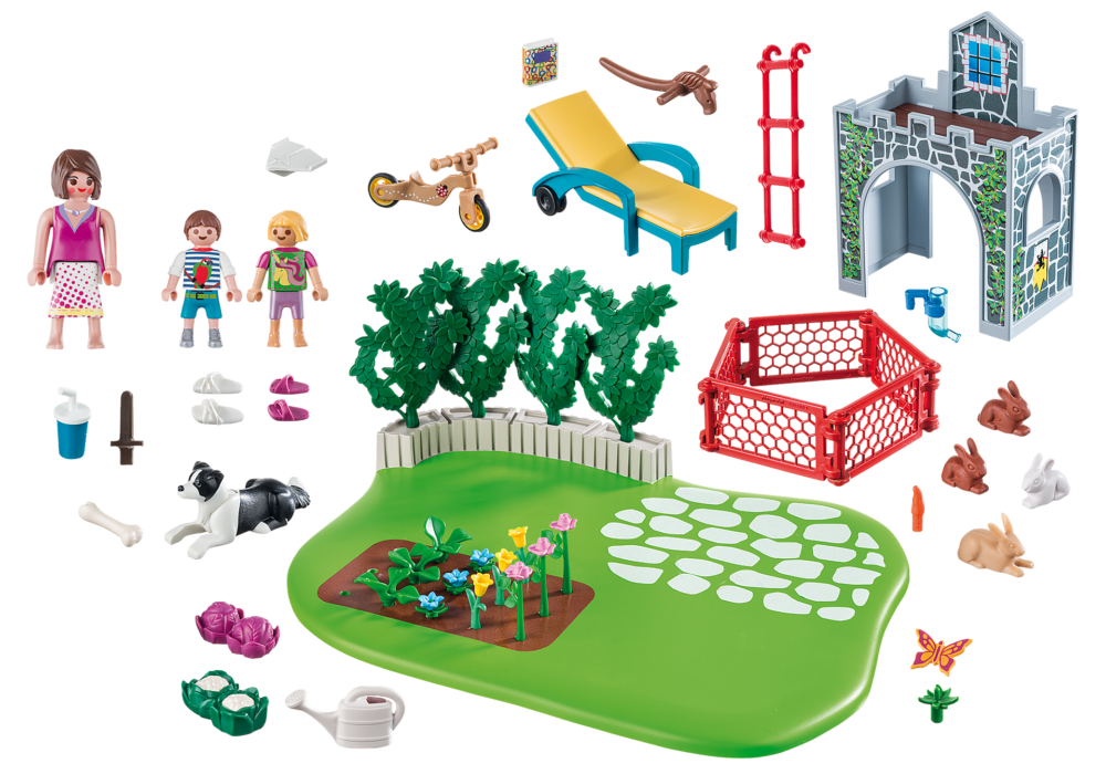 เพลย์โมบิล ซุเปอร์เซ็ต สวนของครอบครัว มาพร้อมกรงสัตว์ขนาดเล็กและแปลงดอกไม้ที่หยิบได้และปะผัก สวนสำหรับครอบครัวที่แสนสบายกำลังคึกคักไปด้วยกิจกรรมต่างๆ ดอกไม้จะต้องได้รับการรดน้ำและกระต่ายได้รับการดูแล แต่ไม่มีปัญหาสำหรับเด็กที่ทำงานหนัก ในขณะที่แม่กำลังทำให้ตัวเองรู้สึกสบาย ๆ บนเก้าอี้บนดาดฟ้าพร้อมเครื่องดื่มเย็น ๆ เด็ก ๆ ก็ตักน้ำได้ หลังจากเสร็จงานคุณสามารถไปที่ปราสาทจำลองเล่นที่ยอดเยี่ยมเพื่อเล่นสนุก