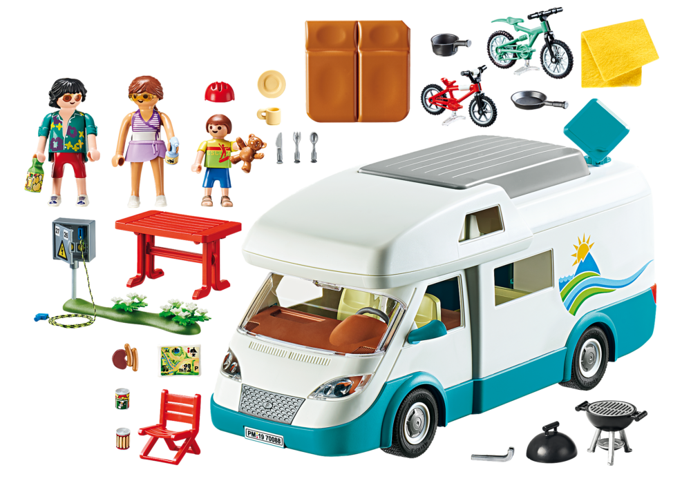 เพลย์โมบิล แคมป์ ร้านบ้าน พบกับความหรูหราและความสนุกในการตั้งแคมป์ในรถบ้านของครอบครัวที่มีอุปกรณ์ครบครัน เที่ยวในช่วงวันหยุดด้วยรถบ้านข้างในมีทั้ง ห้องครัว ห้องอาบน้ำขนาดเล็กและที่นอนหลับ ภายในรถมีที่นั่งหมุนได้และโต๊ะสามารถแปลงเป็นเตียงได้