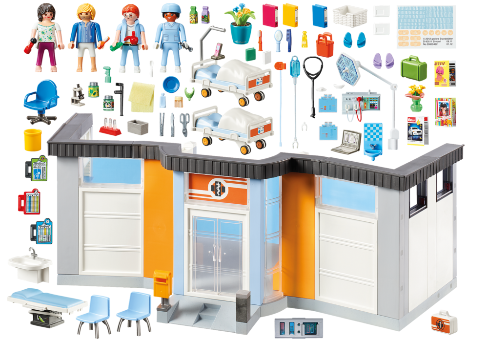 โรงพยาบาล Playmobil มีทุกสิ่งที่คุณต้องการเพื่อสุขภาพที่ดีขึ้น ด้วยเตียงป่วยสำหรับผู้ป่วยและแพทย์ในการดูแลพวกเขา ตรวจสอบให้แน่ใจว่าผู้ป่วยบนเตียงในโรงพยาบาลสุขภาพดีขึ้น และแต่ละคนก็พร้อมที่จะรักษาผู้ป่วยฉุกเฉินอยู่เสมอ ห้องผ่าตัดมีหน้าจอเรืองแสงไฟและอุปกรณ์ทางการแพทย์อื่น ๆ มีห้องสำหรับผู้ป่วยสองคนในห้องผู้ป่วย
