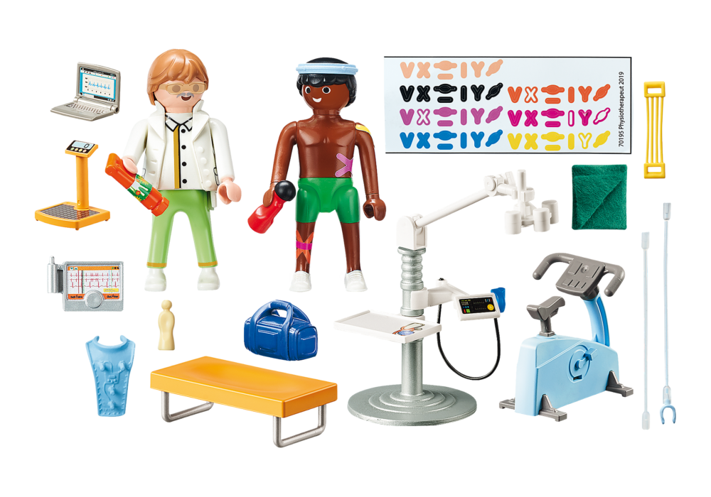 เพลย์โมบิล โรงพยาบาล แผนกกายภาพบำบัดวันนี้มีการตรวจสุขภาพนักกายภาพบำบัด ก่อนอื่นนักบำบัดจะทำการทดสอบความเครียด ผู้ป่วยนั่งบนจักรยานฝึกและเชื่อมต่อกับอุปกรณ์วัดนักกายภาพบำบัดจะต้องตรวจสอบค่าต่างๆอย่างใกล้ชิดขณะปั่น การฝึกฝนอย่างหนักแสดงให้เห็นถึงความสำเร็จ! “” ผู้ป่วยจะมีสุขภาพแข็งแรงอีกครั้งในไม่ช้า สติกเกอร์ เทปที่รวมอยู่สามารถติดกับตัวฟิกเกอร์ได้