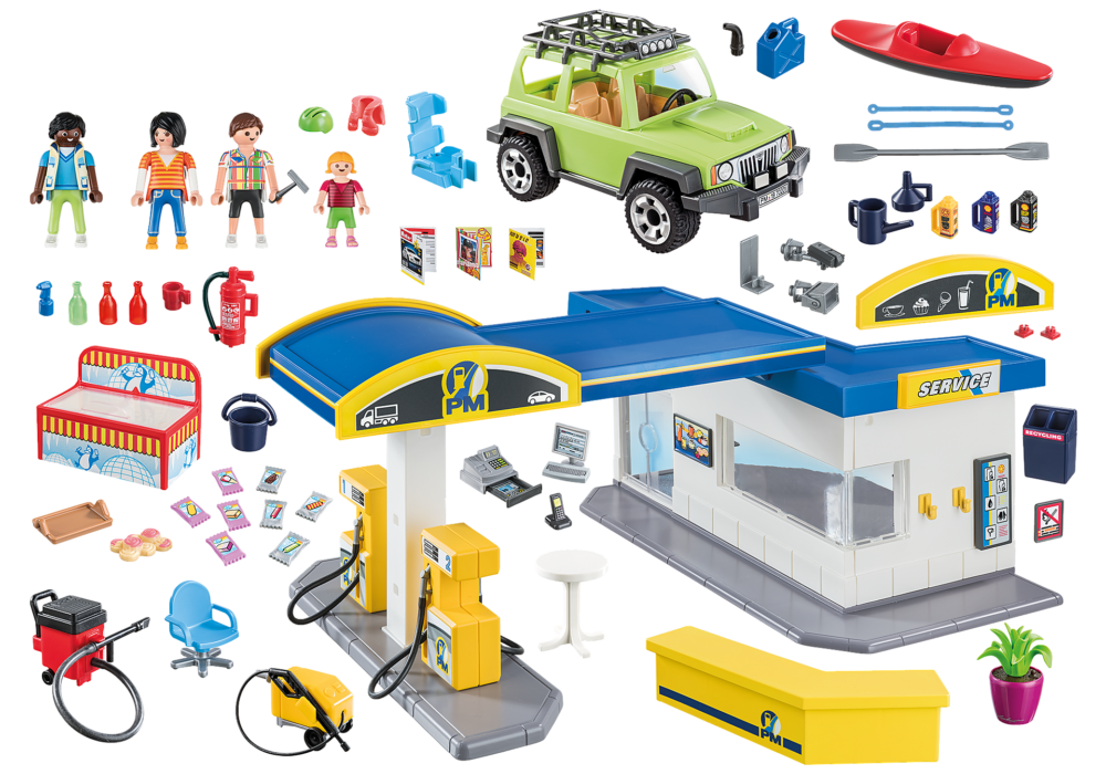 เพลย์โมบิล ยานพาหนะ ปั้มน้ำมัน เมื่อน้ำมันหมดต้องรีบไปยังปั๊มน้ำมันขนาดใหญ่ให้เร็วที่สุด รถยนต์รถบรรทุกและรถจักรยานยนต์สามารถเติมได้ที่นี่ แต่ที่ปั้มน้ำมันมีอะไรมากกว่าน้ำมัน: ในห้องขายขนาดใหญ่คุณสามารถซื้ออาหารอร่อยสำหรับการเดินทางและอุปกรณ์เสริมรถยนต์ต่างๆ สิ่งนี้เหมาะกับนักท่องเที่ยวที่เดินทางไกล ในขณะที่พ่อกำลังเติมเชื้อเพลิงและตรวจสอบการยึดเรือแคนูบนหลังคา จากนั้นก็ไปต่อเพราะยังมีทริปอีกยาวข้างหน้าพวกเขาไปยังจุดหมายปลายทางวันหยุด -ตัวปั้มสามารถประกอบกับเพลย์โมบิล 70202 อู่ซ่อมรถได้