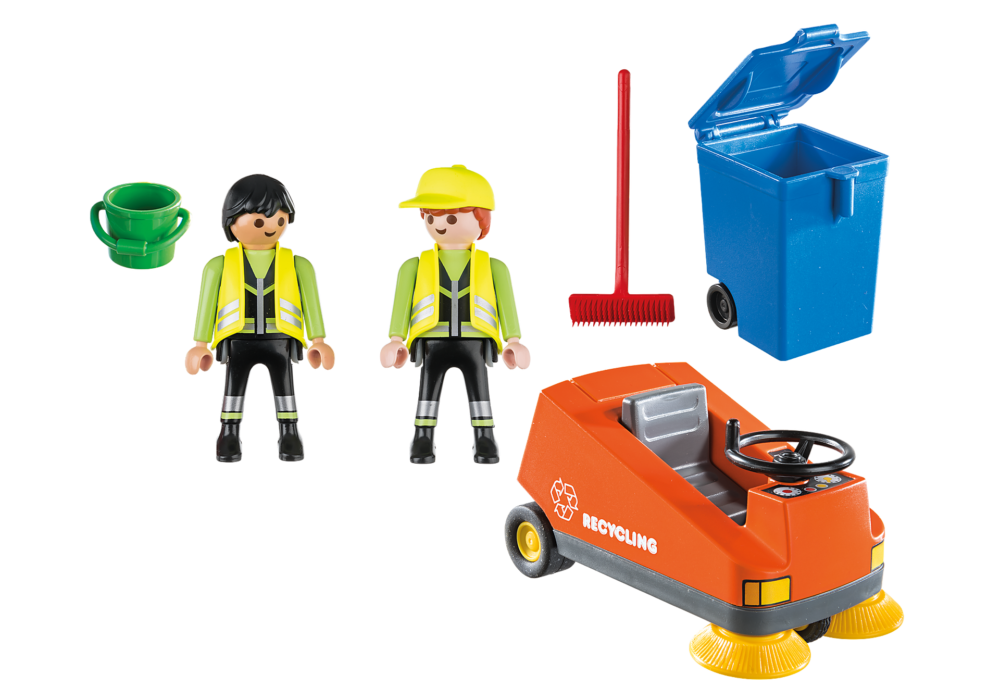ในชุดประกอบด้วย : ฟิกเกอร์พนักงานเก็บขยะ รถทำความสะอาดถนน ถังขยะ ไม้กวาด ฝา