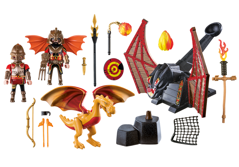 เพลย์โมบิล โนเวลมอร์ ฝึกมังกรไฟ มังกรจะต้องฝึกฝนเป็นประจำเช่นกัน กองทัพเบรินแฮม ได้พัฒนาการฝึกอบรมการต่อสู้ขั้นสูง อุปกรณ์การฝึกอบรมที่แตกต่างกัน เครื่องเหวี่ยงหิน Tyragon เทรนเนอร์มังกรยิงลูกไฟขึ้นไปในอากาศซึ่งมังกรที่ฉลาดหลบเลี่ยงได้ ใครจะเป็นผู้ชนะการต่อสู้ในศึกครั้งนี้? มาร่วมลุ้นไปกับเพลย์โมบิล อัศวินแห่งโนเวลมอร์ โลกแห่งอัศวินใหม่จากPLAYMOBIL®