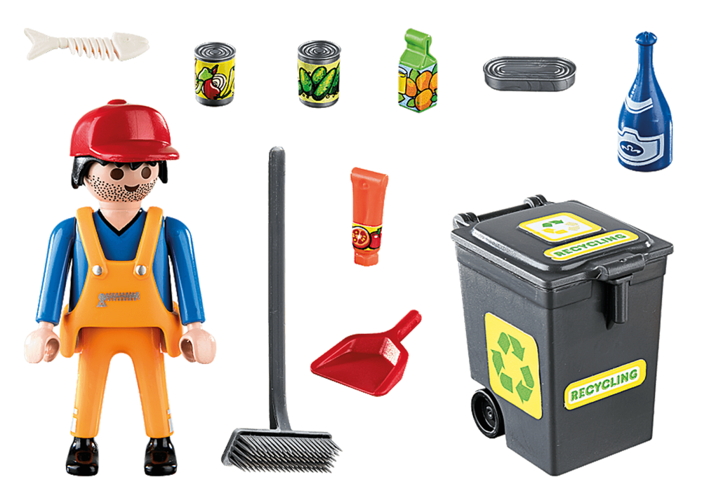 การกำจัดขยะเป็นงานที่ต้องรับผิดชอบพนักงานทำความสะอาดถนนที่พลุกพล่าน ออกไปแล้วในเวลาเช้าตรู่เพื่อให้มีถนนทางเท้าและสวนสาธารณะที่สะอาด ด้วย PLAYMOBIL Special Plus มีความสนุกสนานเป็นพิเศษในราคาเบา ๆ เหมาะเป็นของที่ระลึกสะสมแลกเปลี่ยนและแจกได้