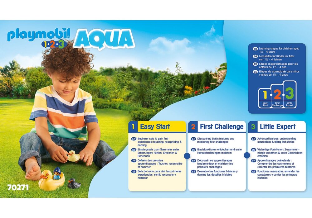ในวันที่อากาศแจ่มใสการเดินทางบนเรือเป็ดก็เป็นเพียงสิ่งเดียวเท่านั้นหญิงสาวก้าวเข้าไปในเป็ดสีเหลืองอย่างมีความสุขและพาคุณออกไปที่ทะเลสาบหลังจากนั้นไม่นานลูกเป็ดสองสามคนก็ร่วมเรือและว่ายน้ำเคียงข้างกัน เป็นวันที่น่ารักกับการก้าวเล็ก ๆ สู่โลก PLAYMOBIL อันยิ่งใหญ่ชุดการเล่นสีสันสดใสจาก PLAYMOBIL-1.2.3 AQUA ที่มีระดับการพัฒนาที่แตกต่างกันกระตุ้นให้เด็ก ๆ ได้รับความสนุกสนานและเกมมากมายเป็ดสามารถลอยน้ำได้ลูกเป็ดก็สามารถลอยน้ำได้
