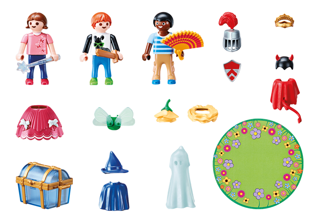 วันนี้เด็ก ๆ แต่งตัวได้สนุกดี! มีเครื่องแต่งกายมากมายในกล่องแต่งตัวขนาดใหญ่มีทุกอย่างสำหรับทุกคน” ฉันแต่งตัวเป็นอัศวิน! ” เด็กชายตะโกน“ วันนี้ฉันจะเป็นนางฟ้าดอกไม้” เด็กหญิงผู้มีความสุขกล่าว เด็ก ๆ ตื่นเต้นมากและมองหาชิ้นส่วนที่เหมาะสมสำหรับการแต่งตัวทันทีจากนั้นพวกเขาก็เล่นชุดการเล่นประกอบด้วยเด็ก PLAYMOBIL สามคน หีบสมบัติสำหรับเครื่องแต่งกายและชิ้นส่วนขนาดเล็กรวมถึงองค์ประกอบต่างๆเช่นหมวกกันน็อกดาบไม้โล่หมวกผ้าคลุมไม้กายสิทธิ์กระโปรงห่วงพัดลมและของแถมอื่น ๆ อีกมากมายสามารถใส่เครื่องแต่งกายที่แตกต่างกันได้ ให้กับตัวละครเด็กทั้งสาม