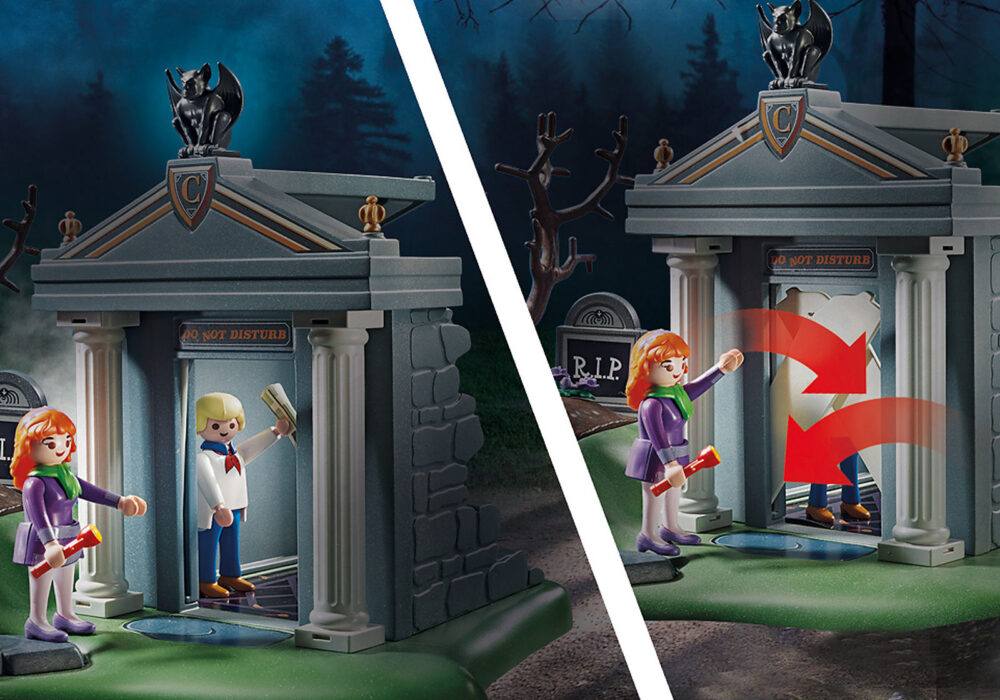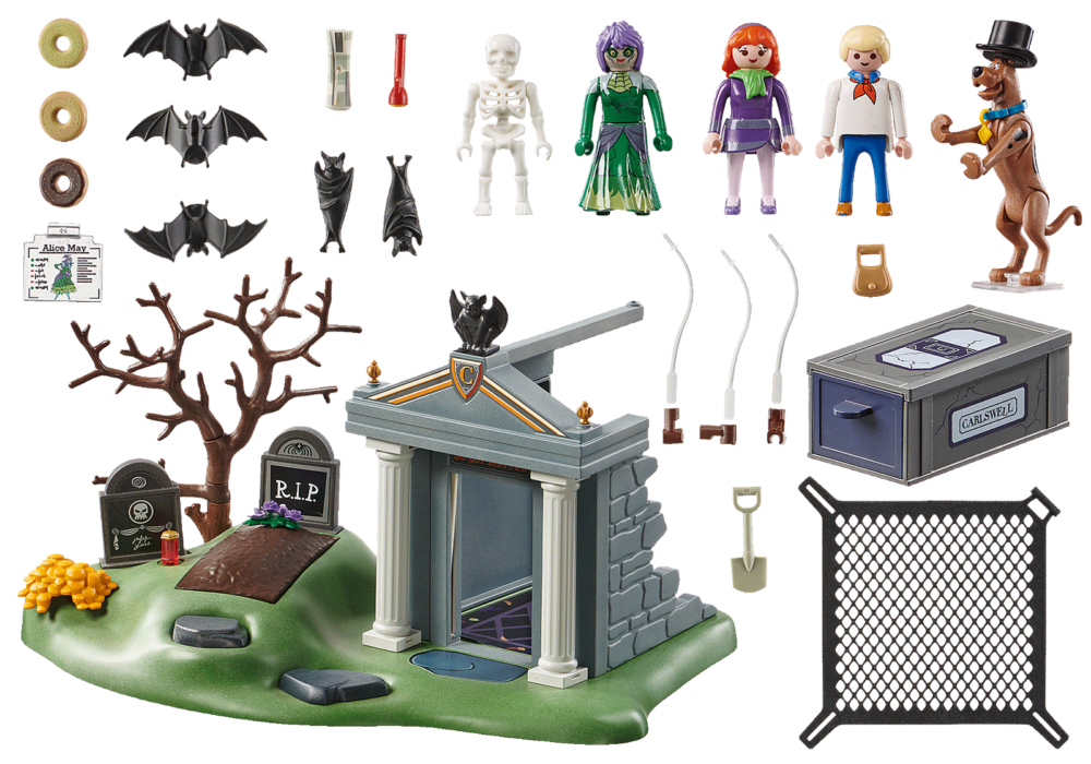 เพลย์โมบิล สคูบี้ดู! ผจญภัยในสุสาน สคูบี้-ดู, เฟรด & แดฟนี่ มีปริศนาที่น่ากลัวให้ไขในสุสาน ความประหลาดใจที่น่ากลัวบางอย่างแฝงตัวอยู่ในสุสานแห่งนี้ ในขณะที่เพื่อน ๆ กำลังตรวจสอบหลุมศพโครงกระดูกที่น่าขนลุกก็กระโดดออกมาจากพื้น (ในการเรียกใช้เพียงแค่กดเทียนที่อยู่ถัดจากหลุมศพ) โครงกระดูกยังเรืองแสงในความมืดเพื่อความสนุกที่น่ากลัวยิ่งขึ้น! นอกจากนี้โลงศพลึกลับที่ปรากฏร่างหายไปในทันใดนั้นก่อให้เกิดปริศนามากมาย! การ์กอยล์เหนือประตูทางเข้าห้องใต้ดินทำหน้าที่เป็นคันโยกลับในการปลดแผ่นหินเหนือประตูทางเข้าซึ่งป้องกันไม่ให้แขกที่ไม่ได้รับเชิญเข้ามาหรือผู้ที่หลบหนีจะหยุดลง แผนที่ผีที่รวมไว้ให้คำแนะนำที่เป็นประโยชน์ในการติดตามผีจากนั้นจับมันด้วยตาข่าย แต่อย่าปล่อยให้ใบหน้าที่เป็นมิตรของผีหลอกคุณ! ผีถูกเปิดโปงอย่างรวดเร็วและคนร้ายตัวจริงถูกเปิดเผย – อลิซเมย์! การ์ดซื้อขายสามารถส่องสว่างและอ่านได้ด้วยความช่วยเหลือของโลงศพในบ้านผีสิงหรือด้วยเครื่องอ่านใน Mystery Machine (70361 และ 70286 – แต่ละใบมีจำหน่ายแยกกัน)