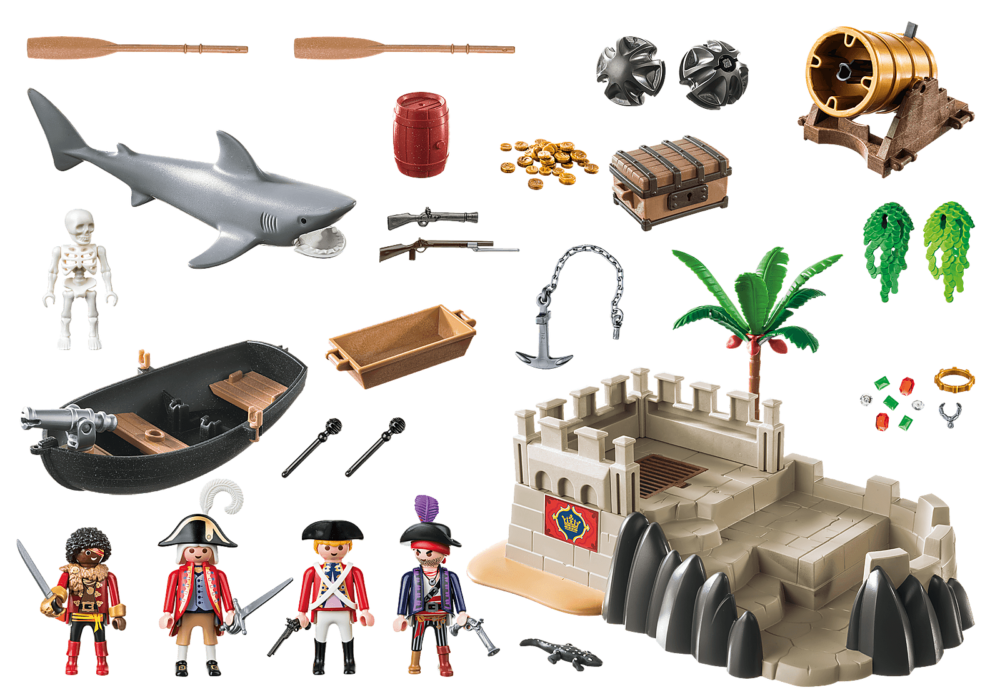 ในชุดประกอบด้วย : ฟิกเกอร์ทหารเรดโคท โจรสลัด โครงกระดูก เรือพาย ฉลาม ลูกจระเข้และอุปกรณ์เสริมอื่นๆ