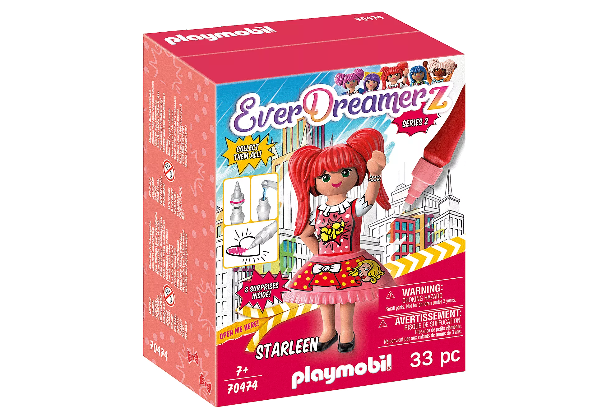 ทีม EverDreamerz กลับมาแล้ว! ใช้เครื่องรางวิเศษเพื่อเดินทางสู่โลกแห่งความฝันใหม่ที่น่าตื่นเต้น – Comic World – เต็มไปด้วยสีสันและลวดลาย! ใน Comic World สามารถสร้างสิ่งใหม่ๆ ได้ง่ายๆ ด้วยการวาด แต่ก็สามารถลบออกได้เช่นกัน ในไม่ช้า สาวๆ ก็ตระหนักว่าสีสันทั้งหมดเริ่มหายไปจาก Comic World แล้วพวกเธอจะทำอย่างไร? เข้าร่วมกับสาว ๆ แต่ละคนในขณะที่เธอค้นพบโลกใหม่ที่มีมนต์ขลังนี้ และแกะกล่องเซอร์ไพรส์สนุก ๆ ในขณะที่คุณไป! เปิด ค้นพบ และสะสม! Starleen เป็นนักแสดงของกลุ่มและชอบร้องเพลงและเต้นรำ เปิดเครื่องรางวิเศษเพื่อเผยประสบการณ์การแกะกล่องอันน่าตื่นเต้นพร้อมเซอร์ไพรส์สนุกๆ เจ็ดอย่างภายใน รวมถึงสร้อยข้อมือและเครื่องรางธนูของคุณเอง! จากนั้นใช้ปากกาน้ำพิเศษเติมสีให้กับรูปวาดของ Starleen เพียงแค่เติมน้ำลงในปากกา แล้วคอยดูขณะที่น้ำกระตุ้นสีบนกระดาษ เมื่อการผจญภัยสุดมหัศจรรย์สิ้นสุดลง เก็บชิ้นส่วนทั้งหมดกลับเข้าไปในกล่องเพื่อให้จัดเก็บได้ง่าย รวบรวมชุด EverDreamerz Comic World ทั้งหมด (รายการ # 70472-70474, 70476-70478) เพื่อความสนุกที่มากยิ่งขึ้น! ในชุดประกอบด้วย Starleen สร้อยข้อมือชาร์มซิลิโคน โบว์ชาร์ม ลูกปัด การ์ดสะสม สติ๊กเกอร์ สัตว์เลี้ยง และอุปกรณ์อื่นๆ อีกมากมาย แนะนำสำหรับอายุเจ็ดปีขึ้นไป คำเตือน. อันตรายจากการสำลัก ชิ้นส่วนขนาดเล็ก ไม่เหมาะสำหรับเด็กอายุต่ำกว่า 3 ปี