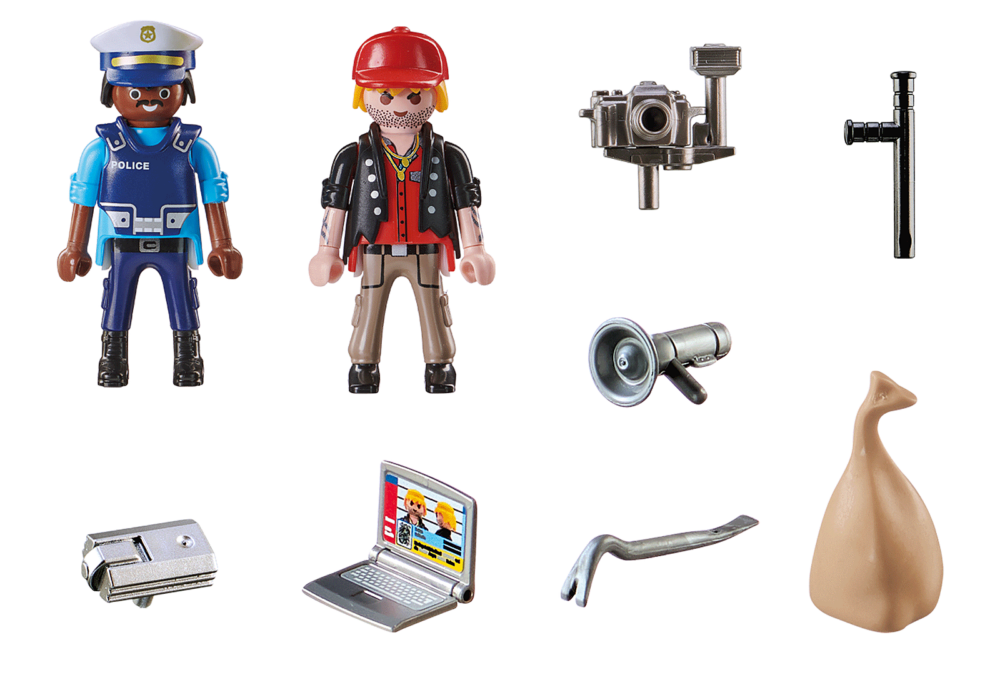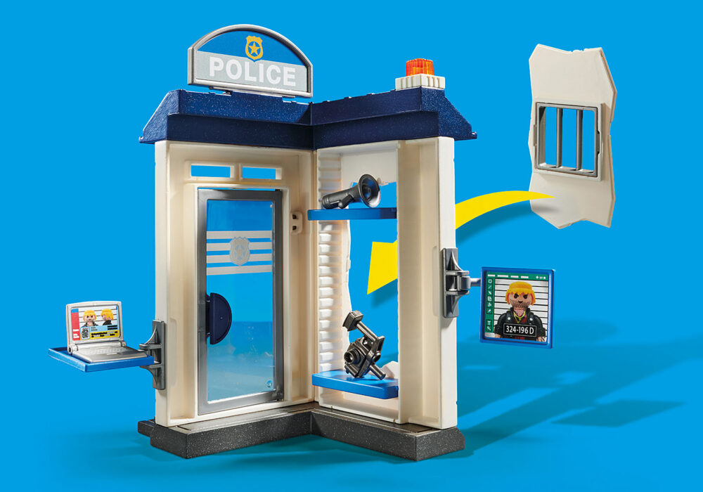 “ตำรวจผู้มีไหวพริบเพิ่งจับโจรได้และขังเขาไว้ข้างหลังลูกกรงและเขาก็แหกคุกออกมาอีกครั้งจริงๆแล้วเขาเจาะช่องในกำแพงคุกและหนีไป แต่ตำรวจผู้กล้าหาญอยู่ใกล้ตัวแล้วการไล่ล่าเริ่มต้นขึ้น! PLAYMOBIL Starter แพ็คคือการแนะนำโลกของ PLAYMOBIL ที่มีขนาดใหญ่และมีสีสันชุดประกอบด้วยส่วนของสิ่งปลูกสร้าง