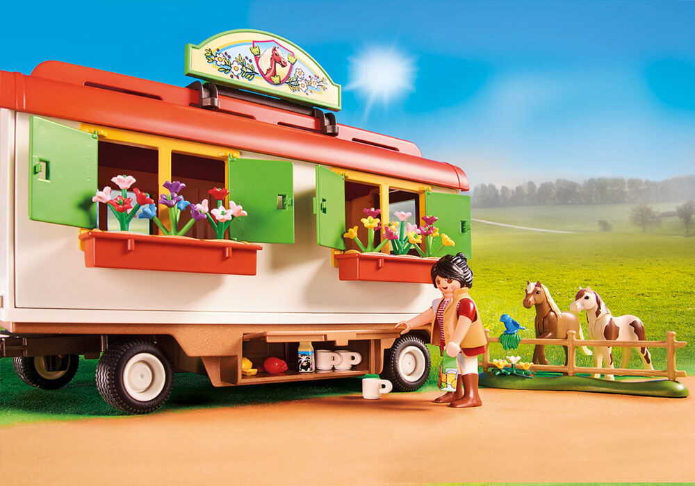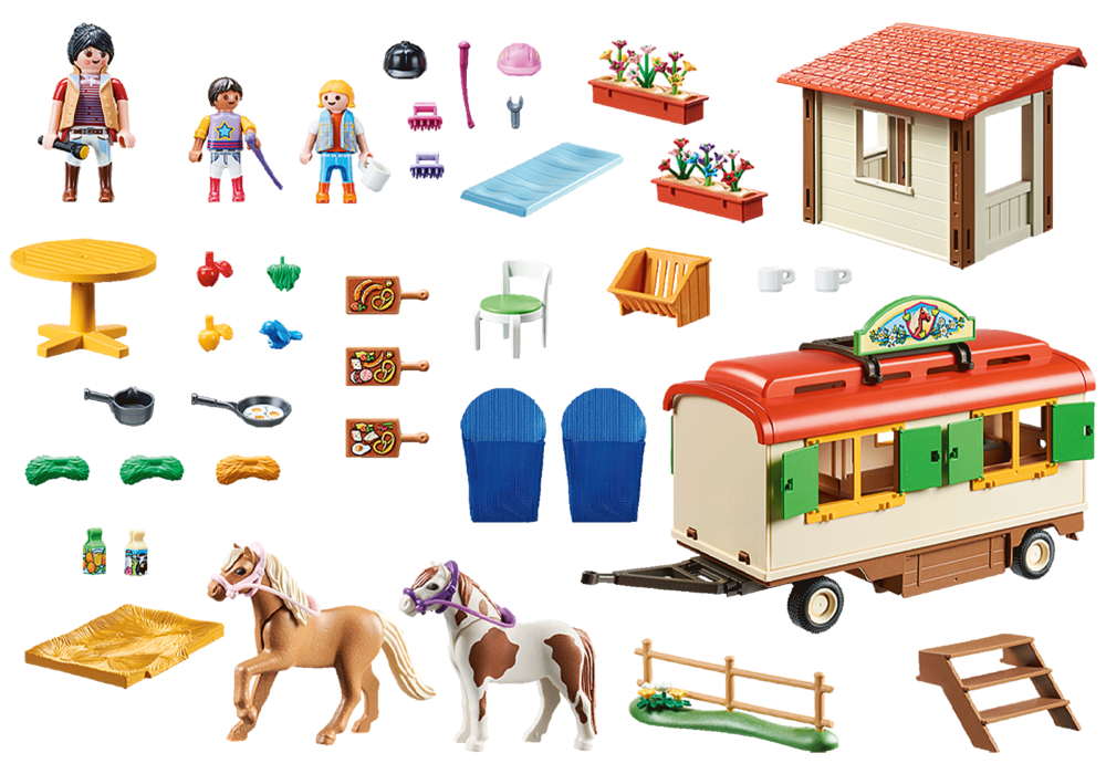 ชุดของเล่นประกอบด้วย : รถเคลื่อนที่สำหรับค้างคืนพร้อมอุปกรณ์สำหรับนอนและทำอาหาร ที่พักพิง ฟิกเกอร์ PLAYMOBIL สามตัว ม้าสองตัว โต๊ะ เก้าอี้ อาหารม้า ถุงนอน และอุปกรณ์พิเศษที่น่ารักอีกมากมายสำหรับการผจญภัยของม้าที่น่าตื่นเต้น