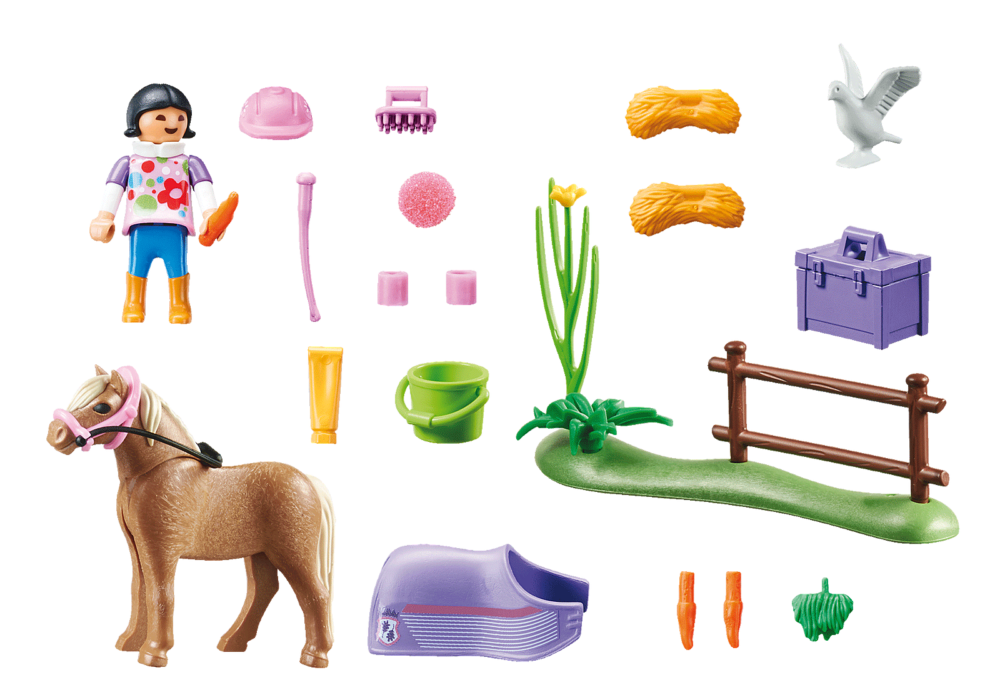 ในชุดของเล่นประกอบด้วย : ฟิกเกอร์เด็กผู้หญิง ม้าไอซ์แลนด์ หญ้าแห้ง ถัง แครอท รั้ว