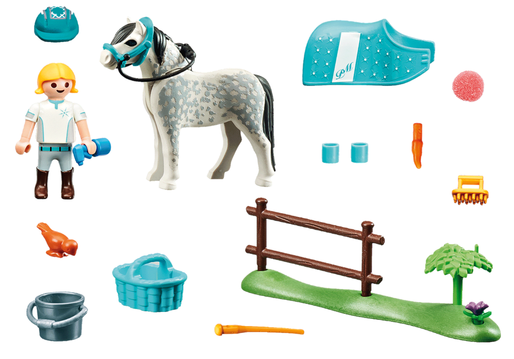 ในชุดของเล่นประกอบด้วย : ฟิกเกอร์เด็กผู้หญิง, ม้าโพนี่, หมวกขี่ม้า, ผ้าห่มม้า, กระเป๋า, ถัง, บังเหียน, แปรงและอื่น ๆ อีกมากมายที่น่ารัก ผ้าห่มสำหรับขี่ม้าและอุปกรณ์เสริมมีสีที่เข้ากัน