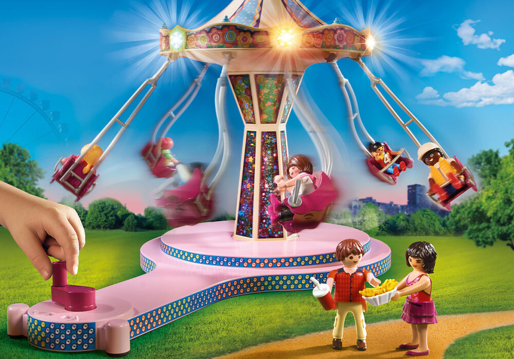 ชุดการเล่นประกอบด้วย : ฟิกเกอร์ PLAYMOBIL 6 ตัวหุ่นเด็ก 5 ตัวม้าหมุนโซ่พร้อมไฟหลากสีเรือชิงช้าบูธขายเครื่องทำน้ำแข็งเครื่องดื่มและของเล่น โซ่หมุนสามารถขับเคลื่อนได้ด้วยมือหมุน แบตเตอรี่ไม่รวมอยู่ในชุด