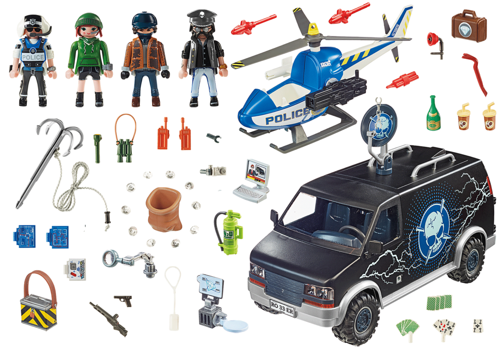 ในชุดการเล่นประกอบด้วย : ฟิกเกอร์ PLAYMOBIL สี่ตัว เฮลิคอปเตอร์พร้อมตะขอเกี่ยวรถตู้คดพร้อมจานดาวเทียมเวิร์กสเตชันคอมพิวเตอร์และชั้นวางในตัวสำหรับเครื่องมือกันขโมย ประตูด้านหลังของรถตู้สามารถเปิดได้หลังคาสามารถถอดออกได้และสามารถเปลี่ยนป้ายทะเบียนได้ด้วยแรงเสียดทาน