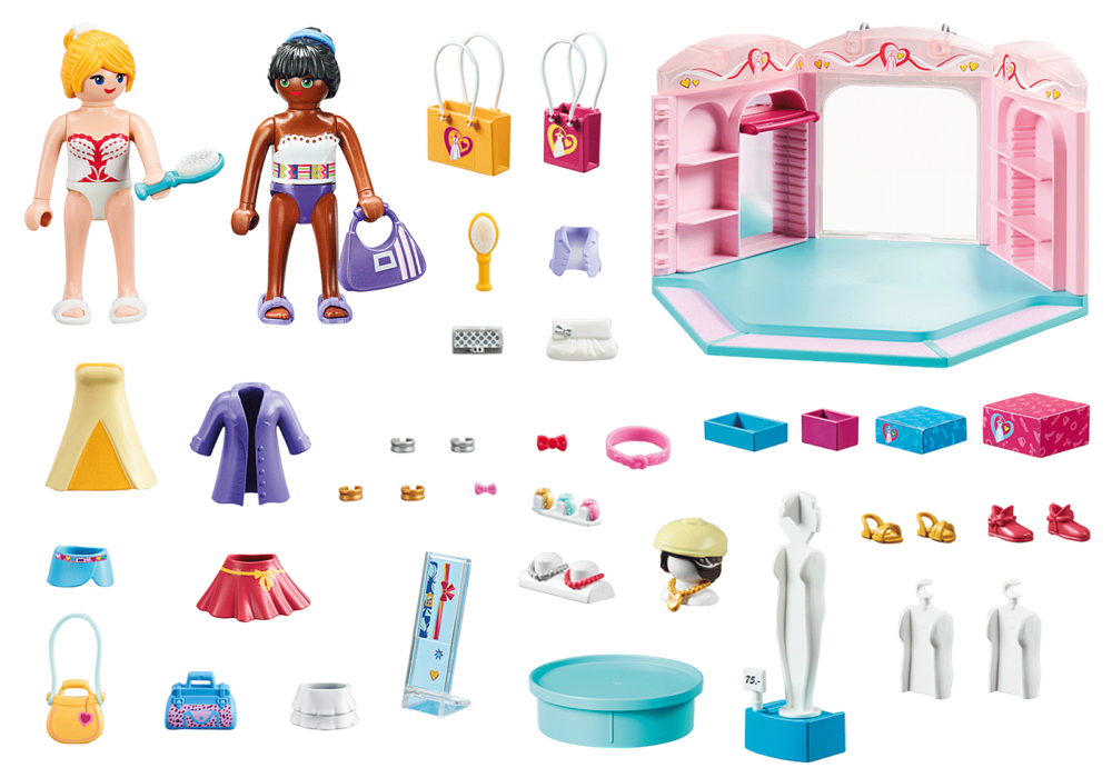 ชุดเล่นประกอบด้วย : แฟชั่นบูติกที่มีชั้นวางเสื้อผ้ารองเท้ากระเป๋าและเครื่องประดับแฟชั่นอื่น ๆ อีกมากมายรวมถึงฟิกเกอร์ PLAYMOBIL สองตัว เสื้อผ้าสามารถตกแต่งด้วยสติกเกอร์ที่แตกต่างกัน ร่วมกับ Fashion Design Studio (70590) และ Kids Fashion Store (70592) จึงมีการสร้างแหล่งช้อปปิ้งที่น่าดึงดูดใจ