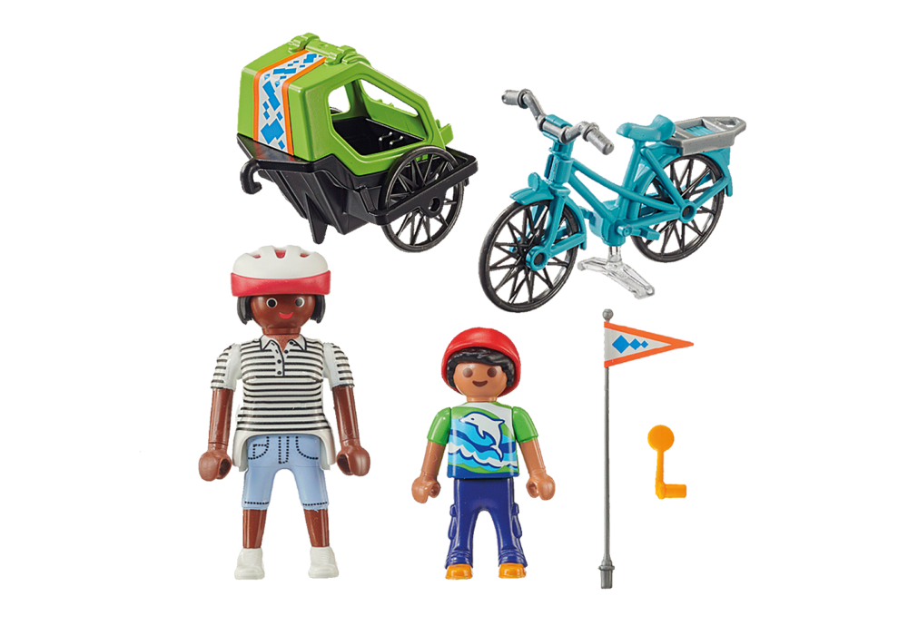 ในทุกโอกาสที่เหมาะสม แม่และลูกต้องออกไปปั่นจักรยาน วันนี้เราไปสวนสาธารณะในเมือง แน่นอนว่าคุณแม่สวมหมวกกันน็อคและลูกชายก็นั่งสบายในรถพ่วงจักรยาน ไปเลย! ฟิกเกอร์ PLAYMOBIL Special Plus พร้อมอุปกรณ์เสริมเป็นของที่ระลึกในอุดมคติ สนุกสุดเหวี่ยง สะสม เล่น แจก!