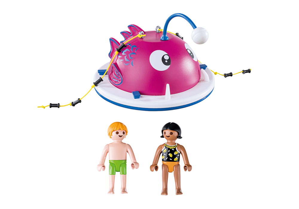 ชุดของเล่นประกอบด้วย : เกาะว่ายน้ำปีนเขาที่มีลักษณะเป็นปลา และฟิกเกอร์ PLAYMOBIL สองตัวในชุดว่ายน้ำ