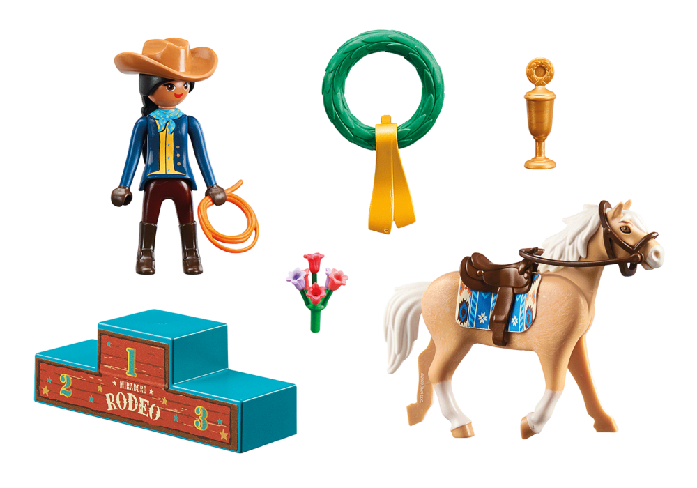 ชุดการเล่นประกอบด้วย : ตัวละคร DreamWorks Spirit Pru และม้า Chica Linda อานบังเหียนและหมวกและอุปกรณ์เสริมอื่น ๆ สำหรับการแสดงโรดิโอที่น่าตื่นเต้น ร่างทรงสามารถขี่ม้าได้