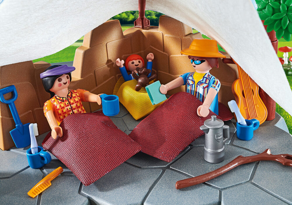 ชุดของเล่นประกอบด้วย : ฟิกเกอร์ PLAYMOBIL สามตัว สุนัข เตาผิง แผ่นปูพื้นที่มีกำแพงพังและผ้าใบกันน้ำ ถุงนอน เบ็ดตกปลา และอุปกรณ์เสริมอื่น ๆ อีกมากมายสำหรับการผจญภัยในแคมป์ที่ยอดเยี่ยม