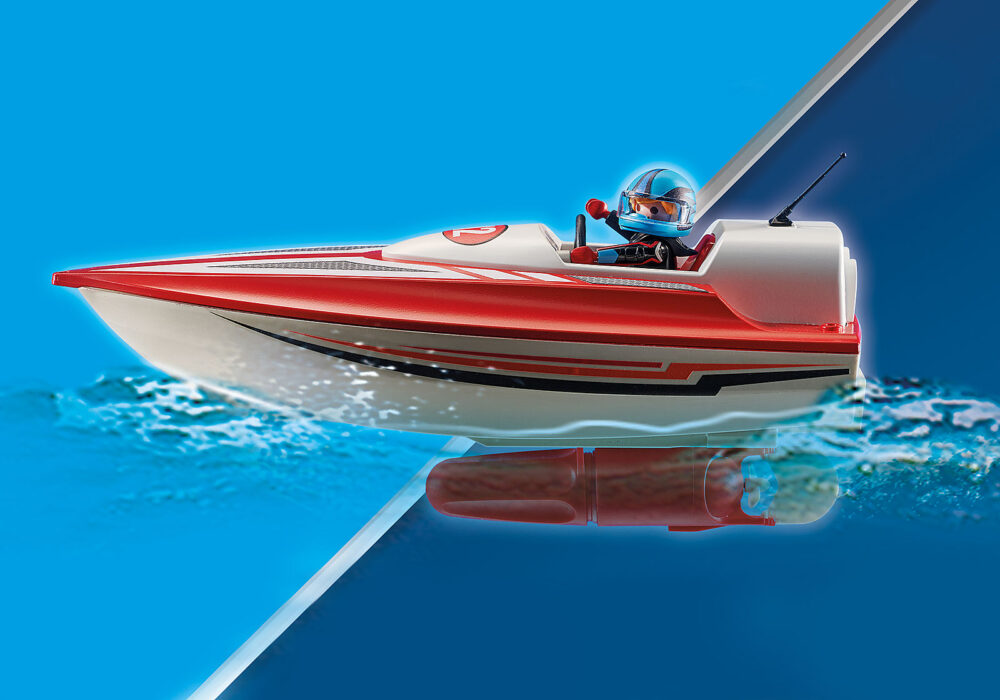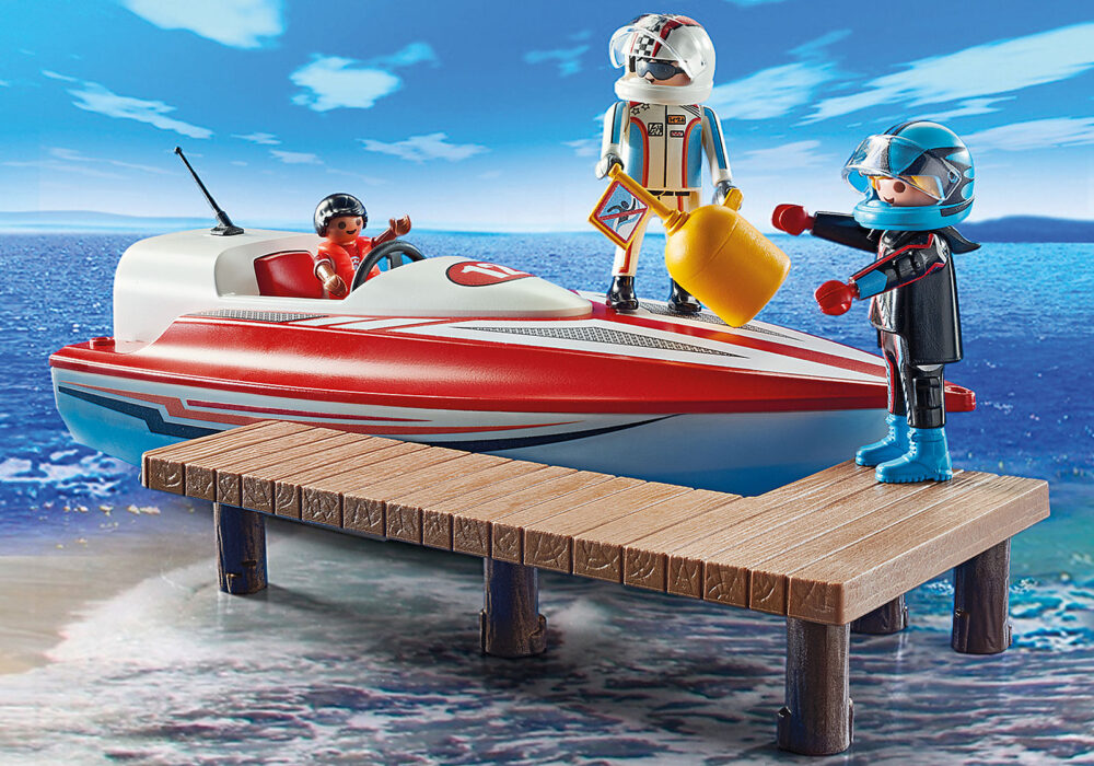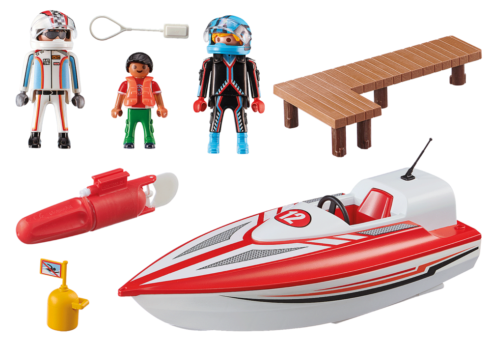 ชุดของเล่นประกอบด้วย : ฟิกเกอร์นักแข่ง PLAYMOBIL สองตัวพร้อมอุปกรณ์ป้องกัน ฟิกเกอร์เด็ก เรือสปีดโบ๊ทพร้อมมอเตอร์ใต้น้ำ ทุ่น และอุปกรณ์เสริมทรงพลังอื่น ๆ อีกมากมาย