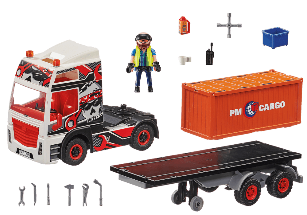 ชุดของเล่นประกอบด้วย : ฟิกเกอร์ PLAYMOBIL รถบรรทุกพร้อมรถพ่วง วิทยุ กล่องเครื่องมือ ขวดน้ำมัน และอุปกรณ์เสริมอื่น ๆ อีกมากมาย รถบรรทุกสามารถอัพเกรดได้ด้วยรีโมทควบคุม RC(6914) หลังคาถอดออกได้ และรถพ่วงแยกจอดได้