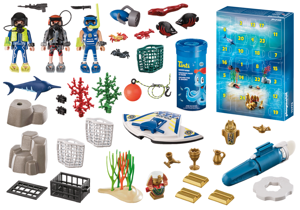 รอของขวัญ 24 วัน? อาจใช้เวลานานมาก แต่ไม่ใช่กับปฏิทินจุติของ PLAYMOBIL ที่มีสีสัน ปีนี้ปฏิทินการมาถึง “ปฏิบัติการดำน้ำตำรวจอาบน้ำแสนสนุก” เป็นเรื่องเกี่ยวกับการดำเนินการของตำรวจที่น่าตื่นเต้นบนพื้นทะเล โจรซ่อนสมบัติล้ำค่าของเขาไว้ใต้น้ำระหว่างปะการัง แต่ตำรวจนักประดาน้ำผู้มีไหวพริบพร้อมแล้วกับสกูตเตอร์ใต้น้ำของพวกเขา ในเวลาไม่นานพวกเขาไม่เพียงแต่จับขโมยเท่านั้น แต่ยังได้ของที่ปล้นมาได้ ฉันคิดว่ามันไม่ได้ผล! ชุดของเล่นประกอบด้วยปฏิทินการถือกำเนิดที่มี 24 เซอร์ไพรส์ ฟิกเกอร์ PLAYMOBIL สามตัว สกู๊ตเตอร์ใต้น้ำขนาดใหญ่และขนาดเล็ก ลูกนาก ปลาไหลมอเรย์ ปลาผีเสื้อ 2 ตัว ล็อบสเตอร์ ปูสองตัว ก้อนหิน ปะการัง และอุปกรณ์ที่ยอดเยี่ยมอื่นๆ สำหรับความตื่นเต้น กิจกรรมใต้น้ำ. ปฏิทินประกอบด้วยสีอาบน้ำ Tinti เป็นพิเศษ เพียงแค่ใส่แท็บเล็ตสีที่แบ่งครึ่งลงในตาข่ายของสกู๊ตเตอร์ดำน้ำ และสกู๊ตเตอร์จะวาดร่องรอยสีเย็นลงในน้ำขณะขับรถ สนุกกับการอาบน้ำที่ยอดเยี่ยมกับ Tinti และ PLAYMOBIL!