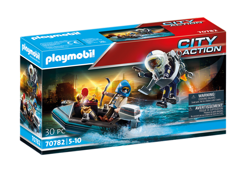 เตือนภัยในเมือง! มีคนบุกเข้าไปในพิพิธภัณฑ์ ตอนนี้ผู้ต้องสงสัยกำลังหลบหนีอยู่ในเรือยาง เขาซ่อนสมบัติของเขาไว้ในถุงนอน แม้ว่าโจรจะเคลื่อนที่อย่างรวดเร็วในเรือของเขา แต่ตำรวจ PLAYMOBIL ที่ฉลาดพร้อมเจ็ทแพ็กของเขาก็อยู่บนส้นเท้าของเขาแล้ว เจ้าหน้าที่เข้าใกล้เรืออย่างรวดเร็วและกระโดดขึ้นไปบนเรือ ไม่กี่นาทีต่อมาก็ จับโจรใส่กุญแจมือเรียบร้อย โชคดีที่วัตถุโบราณล้ำค่าไม่บุบสลายและสามารถส่งคืนได้ที่พิพิธภัณฑ์