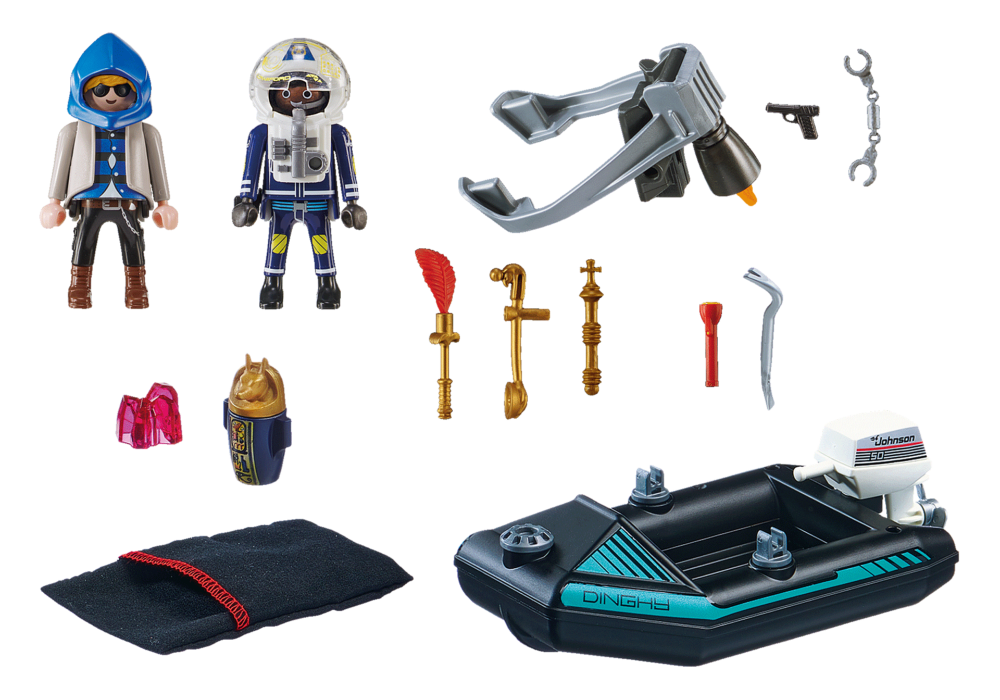 ชุดของเล่นประกอบด้วย : ฟิกเกอร์ PLAYMOBIL สองตัว เรือยางพร้อมเครื่องยนต์ติดท้ายเรือ เจ็ตแพ็ก ถุงนอน งานศิลปะ และอื่นๆ อีกมากมาย เรือสามารถลอยน้ำและสามารถอัพเกรดด้วยมอเตอร์ใต้น้ำได้