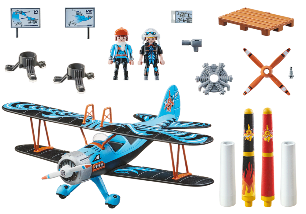 ถึงเวลาออกเดินทางแล้ว! ด้วยเครื่องบินปีกสองชั้นผาดโผนโชว์กลางอากาศเย็นสบาย “ฟีนิกซ์” คุณสามารถเข้าร่วมการผาดโผนที่น่าตื่นเต้น เครื่องยนต์สตาร์ท ใบพัดหมุน และหลังจากเร่งความเร็วบนรันเวย์ได้ไม่นาน เครื่องบินมีปีกสองชั้นก็ลอยขึ้นสู่ท้องฟ้าอย่างสง่าผ่าเผย นักบินแสดงกลอุบายที่น่าทึ่งและบินวนรอบเสาขนาดใหญ่ทั้งสองได้อย่างง่ายดาย ในระหว่างการบังคับการบินครั้งต่อไป มันจะบินเข้าใกล้เสาสีดำมาก แตะที่ด้านบนสุดและกระตุ้นกลไกการพับ โชว์กลางอากาศนี้ฮิตจริง! เครื่องบินมีเสียงเครื่องยนต์ที่แตกต่างกันห้าเสียงซึ่งเปลี่ยนไปตามความเอียงของเครื่องบินปีกสองชั้น เสาสามารถติดกับพื้นผิวเรียบได้อย่างง่ายดาย ในชุดของเล่นประกอบด้วยฟิกเกอร์ PLAYMOBIL สองตัว เครื่องบินปีกสองชั้นพร้อมใบพัดหมุนและโมดูลอิเล็กทรอนิกส์ เสาขนาดใหญ่พร้อมขา 2 เสา เครื่องมือ สกอร์บอร์ด และอุปกรณ์พิเศษอื่นๆ อีกมากมายสำหรับชั่วโมงการบินที่น่าตื่นเต้นในห้องเด็ก