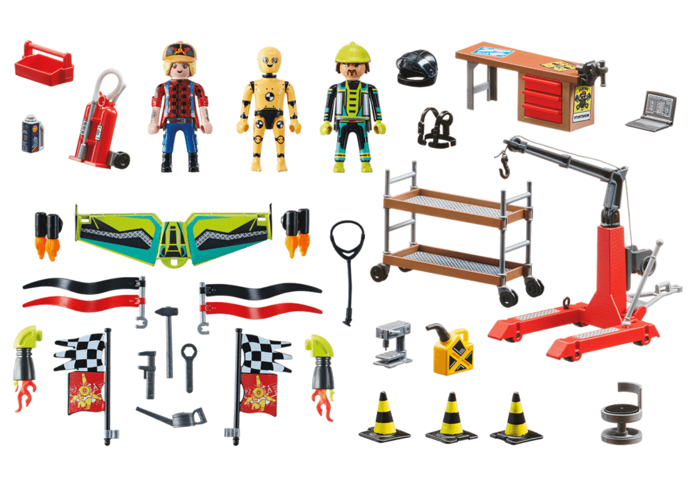 วัตถุบินและชิ้นส่วนแต่ละชิ้นได้รับการบริการและซ่อมแซมในสถานีบริการ รวม เครนเคลื่อนที่พร้อมกว้านและชุดปีก ในสถานีบริการการแสดงผาดโผนทางอากาศ เครื่องบินจะได้รับบริการและนำกลับเข้าสู่ท้องถนน นักบินเพิ่งมาที่โรงปฏิบัติงานพร้อมกับชุดปีกนกที่ชำรุด ช่างเครื่องยกเครื่องบินด้วยเครนอย่างระมัดระวัง เพื่อให้เธอสามารถตรวจสอบได้จากทุกด้าน หัวฉีดขับเคลื่อนเสียและจำเป็นต้องเปลี่ยน โชคดีที่สถานีบริการมีอุปกรณ์ครบครันและมีหัวฉีดสำหรับเปลี่ยนให้พร้อม หลังจากนั้นไม่นาน นักบินสามารถสวมและทดสอบชุดปีกนกได้อีกครั้ง ในชุดประกอบด้วยฟิกเกอร์ PLAYMOBIL สองตัว, ชุดติดปีก, โต๊ะทำงาน, เครนเคลื่อนที่พร้อมสายดึง, กล่องเครื่องมือพร้อมเครื่องมือ และอุปกรณ์พิเศษอื่นๆ อีกมากมายสำหรับการซ่อมเครื่องบินต่างๆ