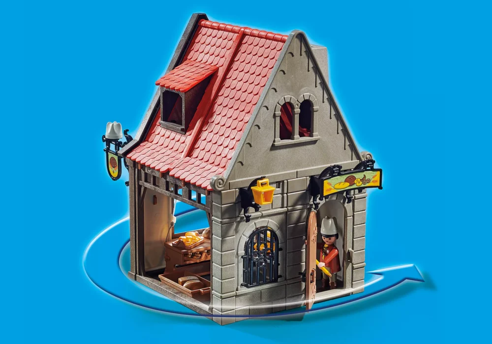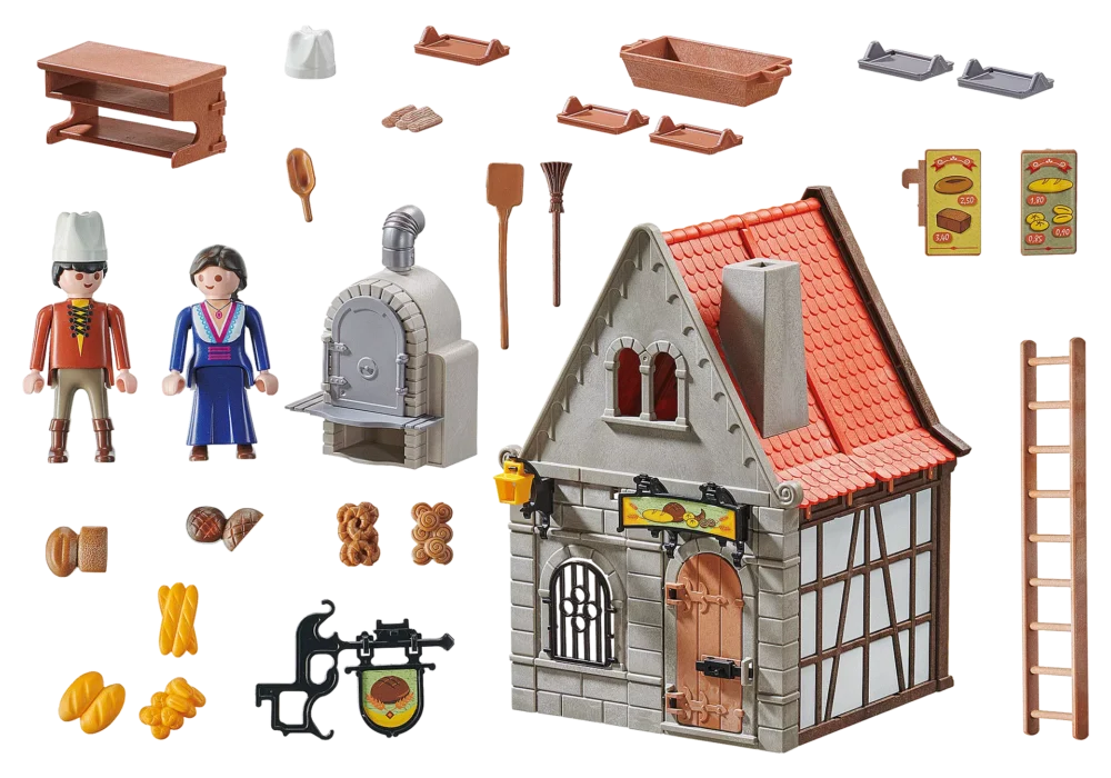 ยินดีต้อนรับสู่ร้านเบเกอรี่ยุคกลาง ขนมปังและขนมอบแสนอร่อยทุกชนิดทำขึ้นที่นี่และขายผ่านหน้าต่างที่เปิดอยู่ เตาอบหินขนาดใหญ่อุ่นด้วยไม้และทำให้ขนมอบมีความกรอบเป็นพิเศษ หลังจากประสบความสำเร็จในการขายมาทั้งวัน ทุกอย่างจะถูกทำความสะอาดและปิดฝาจนถึงเช้าวันถัดไป ชุดของเล่นประกอบด้วยฟิกเกอร์ PLAYMOBIL สองตัว ร้านเบเกอร์รี่พร้อมเตาอบ ขนมอบต่างๆ และสิ่งพิเศษอื่นๆ อีกมากมายสำหรับการผจญภัยที่สร้างสรรค์ ชุดการเล่นสามารถเล่นแยกกันหรือเล่นรวมกับบ้านประวัติศาสตร์ (70957)