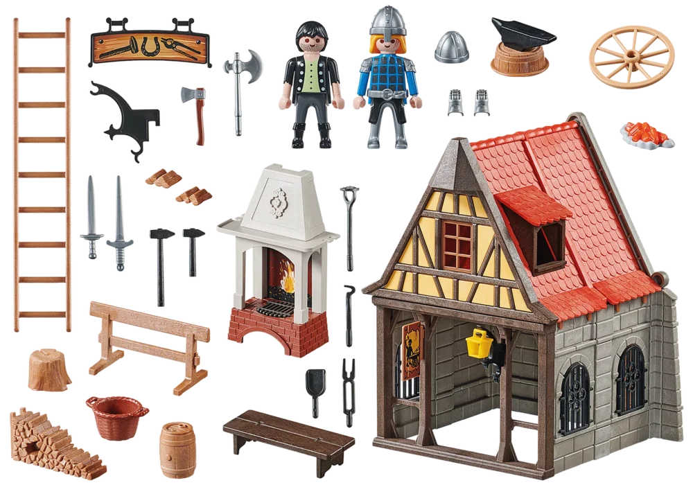 ชุดของเล่น 85 ชิ้นประกอบด้วยโรงตีเหล็กยุคกลาง ช่างตีเหล็ก ทหาร โรงตีเหล็ก ค้อนและทั่ง และอุปกรณ์พิเศษอื่นๆ อีกมากมาย เมื่อใช้ร่วมกับฉากอื่นๆ จากซีรีส์ PLAYMOBIL History (70953, 70954, 70955, 70957, 70958 – มีจำหน่ายแยกต่างหาก) คุณสามารถสร้างเมืองในยุคกลางของคุณเองได้
