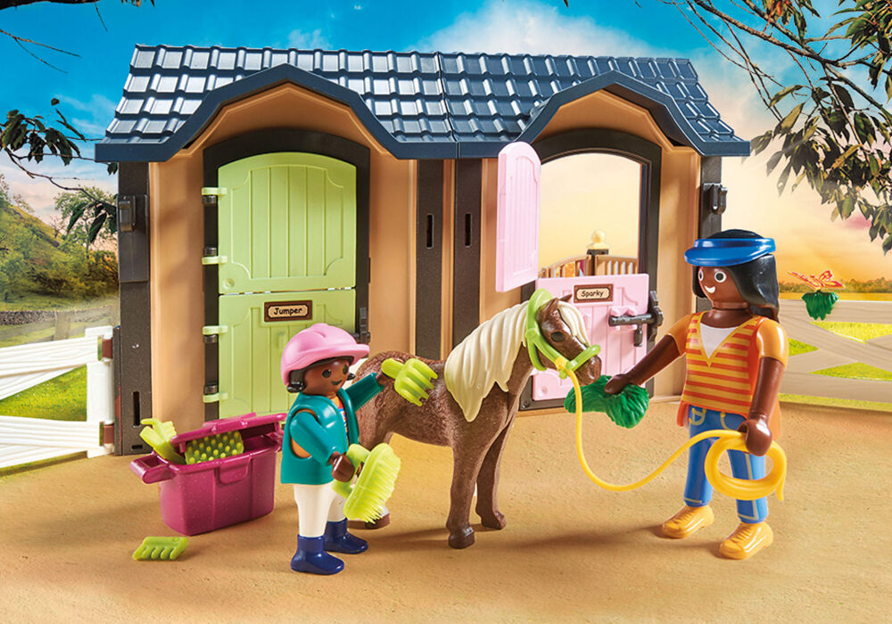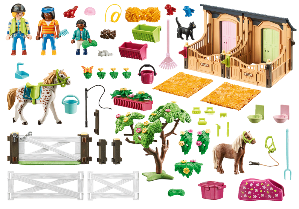 ชุดของเล่นประกอบด้วย : ฟิกเกอร์ PLAYMOBIL สามตัว ม้า ม้าโพนี่ แมว หนูเมาส์ กล่องคอกม้าสองตัว รั้วและประตูสองบาน เช่นเดียวกับอาน เชือกแขวนคอ และอุปกรณ์เสริมสำหรับการดูแลม้า สามารถเขียนฉลากที่ให้มาและติดเข้ากับประตูโรงนาได้ สามารถร้อยรั้วและประตูเข้าด้วยกันได้ตามต้องการ