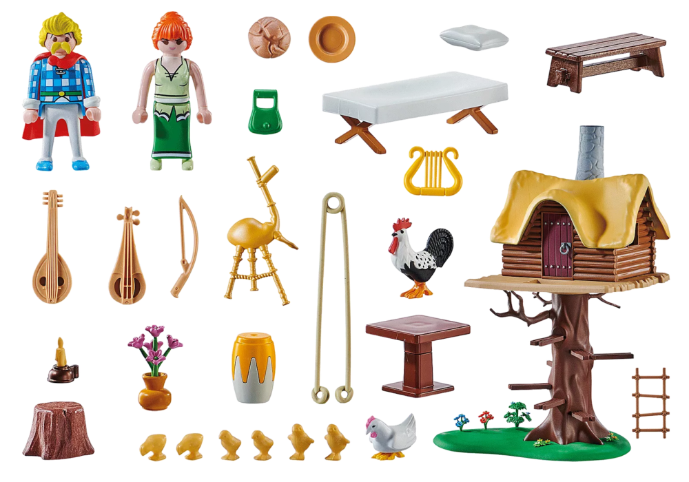 ชุด PLAYMOBIL ประกอบด้วยกวี Troubadix และ Mrs. Methusalix บ้านต้นไม้ Troubadix พร้อมเฟอร์นิเจอร์และหลังคาที่ถอดออกได้ ปี่สก็อต ไวโอลิน พิณ และอุปกรณ์เสริมอื่น ๆ อีกมากมายสำหรับการผจญภัยที่น่าตื่นเต้นของกอล ฟิกเกอร์สามารถผูกและผูกติดกับกิ่งไม้ด้วยเชือกที่ให้มา