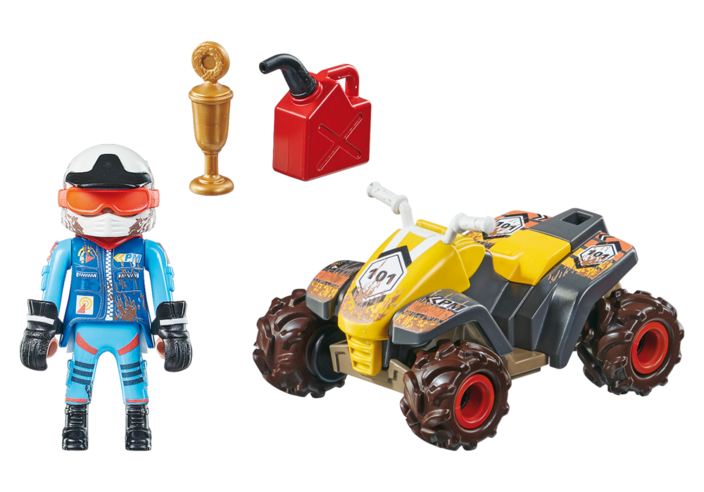 เตรียมพร้อมสำหรับการแข่งรถที่น่าตื่นเต้นด้วย PLAYMOBIL off-road quad ด้วยยางที่หนาและแข็งแกร่ง นักแข่งสามารถแข่งขันได้ในทุกเส้นทางและเอาชนะอุปสรรคทั้งหมดได้ เข้าโค้งอย่างชำนาญแม้ในโค้งที่แคบที่สุดและทิ้งคู่แข่งทั้งหมดไว้ข้างหลังได้อย่างง่ายดาย ในตอนจบ ถ้วยรางวัลของผู้ชนะอยู่ไม่ไกลแล้ว ด้วยมอเตอร์แบบดึงกลับที่ใช้งานได้จริง ควอดรถแข่งจึงรับประกันการแข่งขันที่เข้มข้นในห้องเด็ก เป็นของขวัญหรือของที่ระลึกที่ดีสำหรับเด็กอายุ 4 ปีขึ้นไป