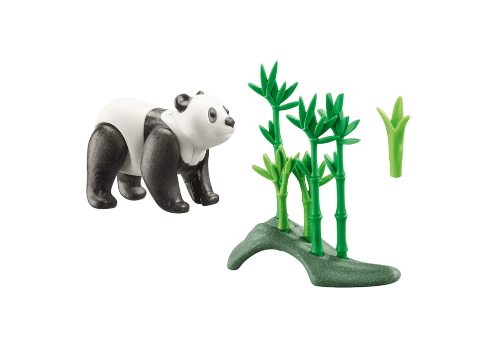 ชุด PLAYMOBIL ประกอบด้วยแพนด้า ต้นไผ่ หญ้า และการ์ดความรู้เกี่ยวกับสัตว์