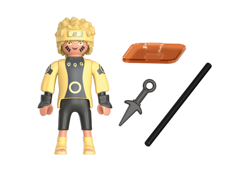 เข้าร่วมกับ Uzumaki Naruto ที่น่ารักในการเดินทางผจญภัยเพื่อเป็น Hokage ชุด PLAYMOBIL ประกอบด้วยตัวละคร NARUTO SHIPPUDEN Uzumaki Naruto ในโหมดเซียนหกวิถี ที่สวมเสื้อสีเหลือง กางเกงสีดำ และรองเท้าแตะสีเหลือง รวมถึงไม้เท้าและคุไน
