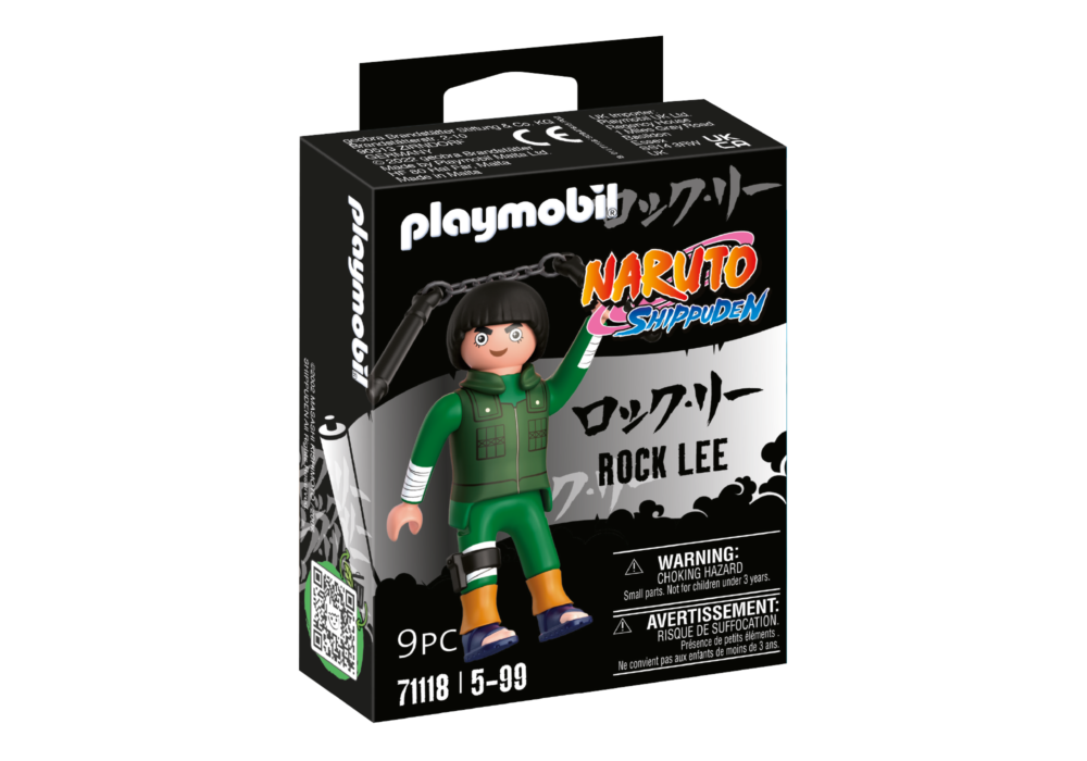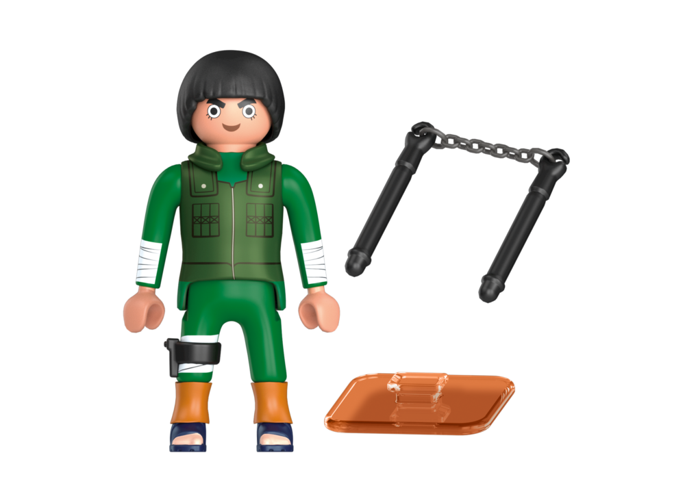 ชุด PLAYMOBIL ประกอบด้วยตัวละคร Rock Lee ของ NARUTO SHIPPUDEN ที่มีผมทรงตามแบบฉบับของเขา คิ้วที่โดดเด่นของเขา สวมบอดี้สูทสีเขียวพร้อมเสื้อกั๊ก