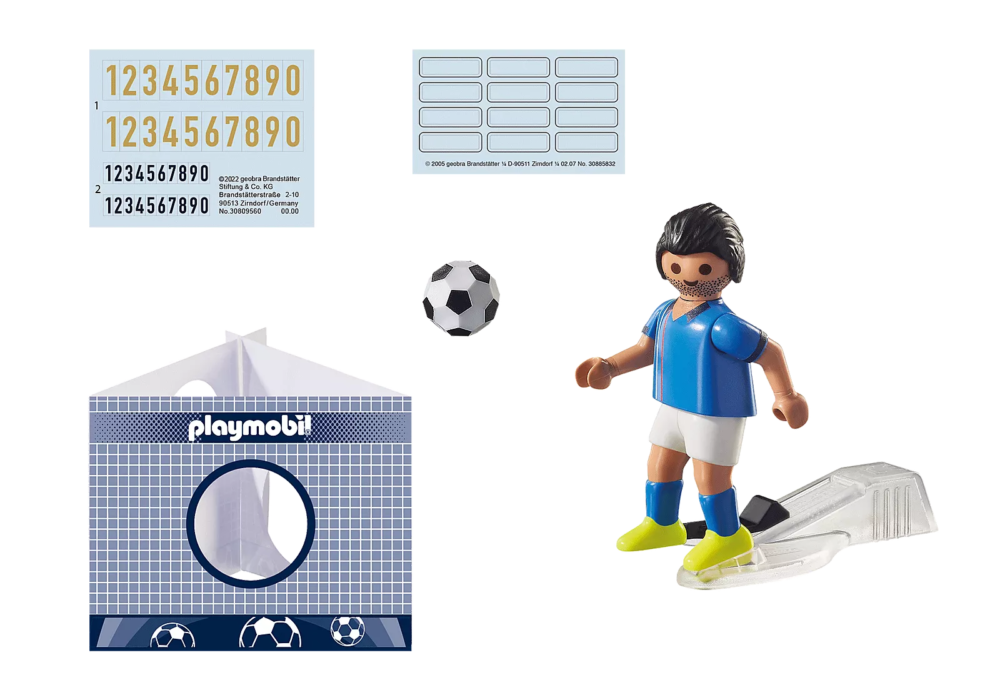 ดาราฟุตบอล PLAYMOBIL พร้อมแล้วสำหรับทัวร์นาเมนต์ใหญ่ นักเตะจากอิตาลีทุ่มเททุกอย่างเพื่อทีมของเขา ทีมไหนจะชนะ? ด้วยฟังก์ชันการเตะด้วยมือเดียวที่ใช้งานได้จริง ทำให้สามารถวางลูกบอลทั้งแบนและสูงในลักษณะที่เป็นเป้าหมายได้ รวมทั้งผนังประตูกระดาษแข็ง มีความสนุกสนานฟุตบอลมากยิ่งขึ้นเมื่อรวมกับสนามฟุตบอล (71120) ด้วยป้ายเปล่าที่ปิดอยู่ คุณสามารถติดป้ายแต่ละรูปด้วยชื่อและหมายเลขประจำเครื่องของเครื่องเล่นที่คุณชื่นชอบ
