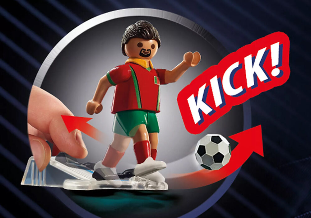 “ด้วยฟังก์ชันเตะจริง ฟุตบอล และผนังเป้าหมายกระดาษแข็ง 3 ด้านสำหรับฝึกซ้อมดาราฟุตบอล PLAYMOBIL พร้อมแล้วสำหรับทัวร์นาเมนต์ใหญ่ นักฟุตบอลจากโปรตุเกสทุ่มเททุกอย