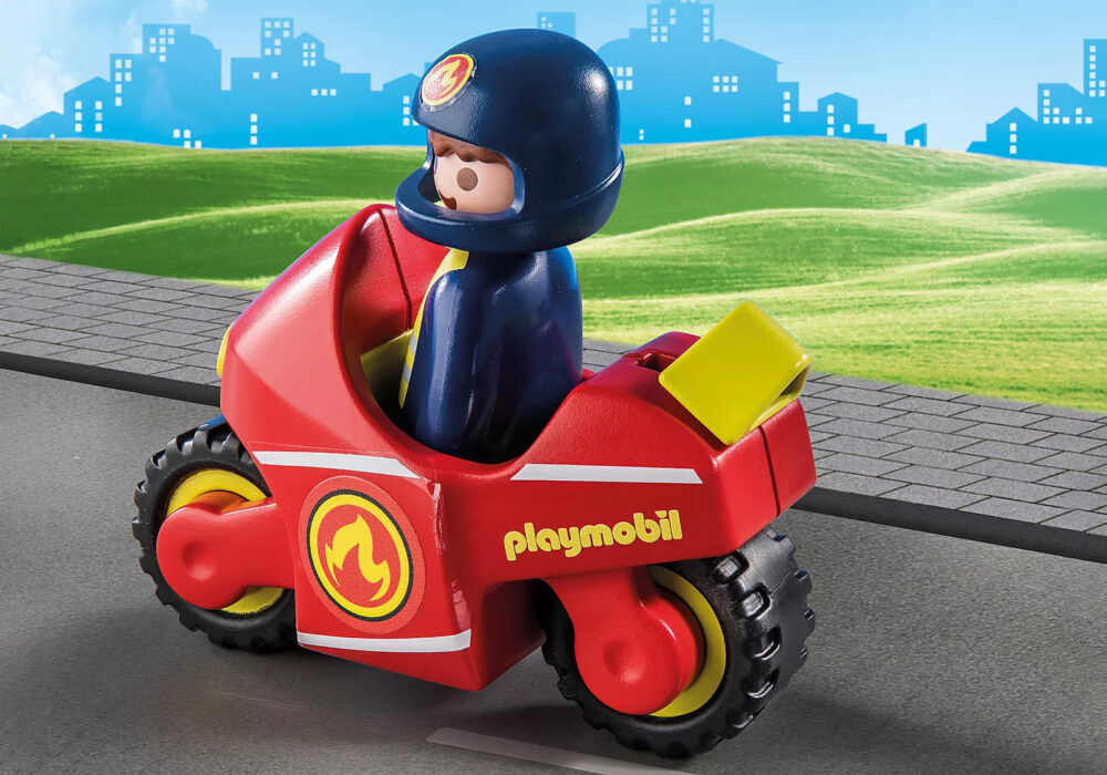 ชุดของเล่นประกอบด้วยรถจักรยานยนต์ดับเพลิงพร้อม “เสียงขับขี่” ไฟจราจรแบบปรับได้เพื่อเรียนรู้กฎจราจรข้อแรกและรถฉุกเฉิน เจ้าหน้าที่ตำรวจ นักดับเพลิง และแพทย์ คือฮีโร่ในชีวิตประจำวันของเรา หากมีคนต้องการความช่วยเหลือทันที ด้วยมอเตอร์ไซค์เก๋ไก๋ของเขา พนักงานดับเพลิงจะอยู่ที่เกิดเหตุในพริบตาเสมอ แพทย์มาถึงรถพยาบาลของเธอ ของแพทย์ถูกเก็บไว้ในหีบอย่างปลอดภัย ในขณะเดียวกัน เจ้าหน้าที่ตำรวจได้เข้ารักษาที่เกิดเหตุและตั้งสามเหลี่ยมเตือน จากนั้นเขาก็ควบคุมการจราจรที่สัญญาณไฟจราจร ด้วยชุดของเล่นแสนน่ารักจาก PLAYMOBIL 1.2.3 เด็กเล็กอายุ 1.5 ปีสามารถเริ่มต้นในโลก PLAYMOBIL อันใหญ่โตที่เต็มไปด้วยสีสัน สัมผัสประสบการณ์เกมสวมบทบาทเกมแรกและเรียนรู้อย่างสนุกสนาน ระดับการเรียนรู้สามระดับที่สร้างจากกันและกันจะส่งเสริมทักษะยนต์ปรับ ความคิดสร้างสรรค์ การพัฒนาภาษา ความเข้าใจด้านความรู้ความเข้าใจ และทักษะทางสังคม