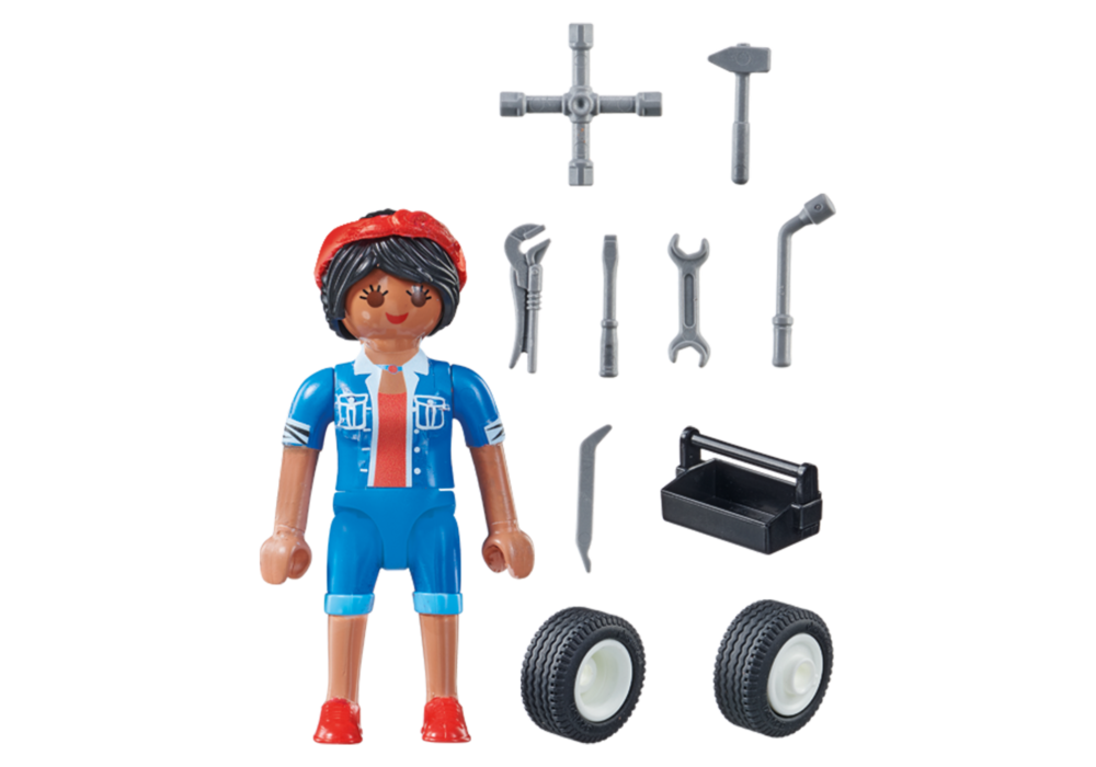 ชุด Special Plus ประกอบด้วยฟิกเกอร์ PLAYMOBIL ยางสองเส้น กล่องใส่เครื่องมือ และชุดเครื่องมือ เครื่องมือสามารถเก็บไว้ในกล่องเครื่องมือ ฟิกเกอร์ PLAYMOBIL Special Plus มอบความสนุกที่ยอดเยี่ยมพร้อมอุปกรณ์เสริมมากมายสำหรับเด็กอายุ 4 ปีขึ้นไป หุ่นของเล่นแสนรักสามารถเล่นแยกกันหรือเล่นรวมกับโลกธีมอื่นๆ ของ PLAYMOBIL ได้