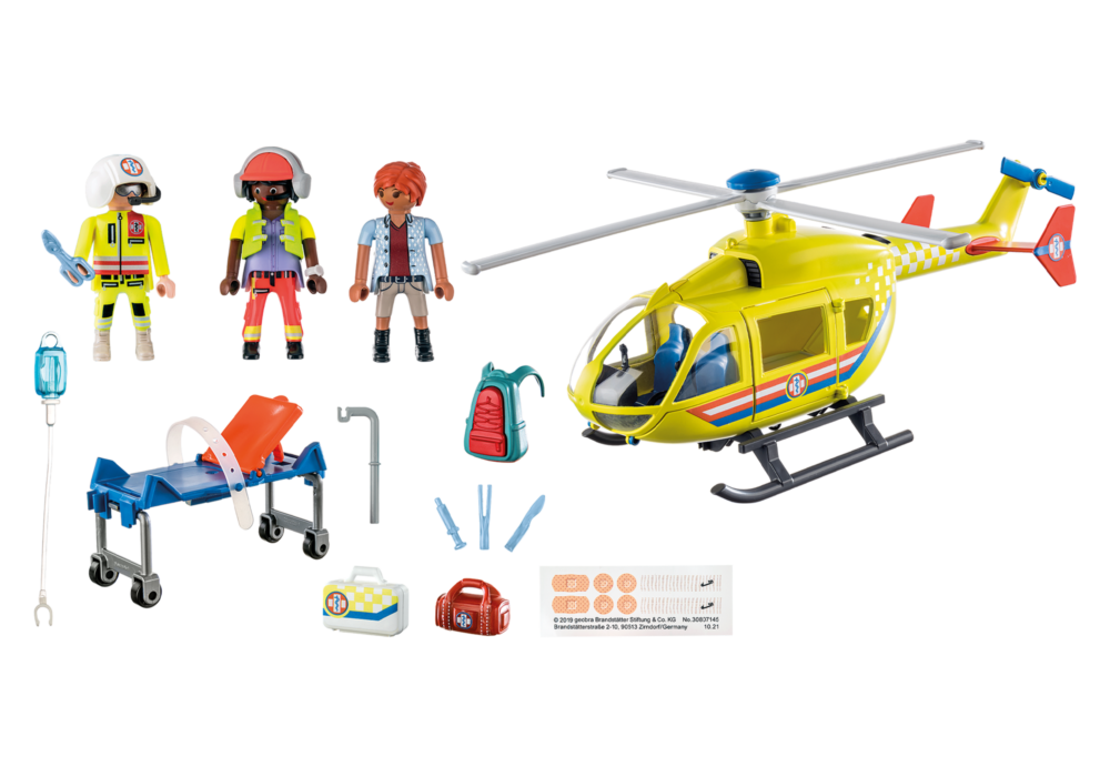 เริ่มเที่ยวบินค้นหาและกู้ภัยที่น่าตื่นเต้นด้วยเฮลิคอปเตอร์กู้ภัยที่ทันสมัยจาก PLAYMOBIL เฮลิคอปเตอร์ที่มีใบพัดที่หมุนได้ เช่นเดียวกับประตูด้านข้าง ประตูท้าย และหน้าต่างห้องนักบินที่สามารถเปิดได้ มีที่ว่างสำหรับนักบินสองคนในห้องนักบิน ผู้ป่วยที่ได้รับบาดเจ็บสามารถถูกผลักขึ้นเฮลิคอปเตอร์บนเปลหามและพาตัวส่งโรงพยาบาลได้ กรณีของแพทย์และอุปกรณ์ปฐมพยาบาลอยู่บนเรือเพื่อการปฐมพยาบาล ณ จุดเกิดเหตุ ชุดของเล่นที่มีรายละเอียดสำหรับเด็กที่อยากรู้อยากเห็นซึ่งต้องการดื่มด่ำกับชีวิตประจำวันของเจ้าหน้าที่กู้ภัย