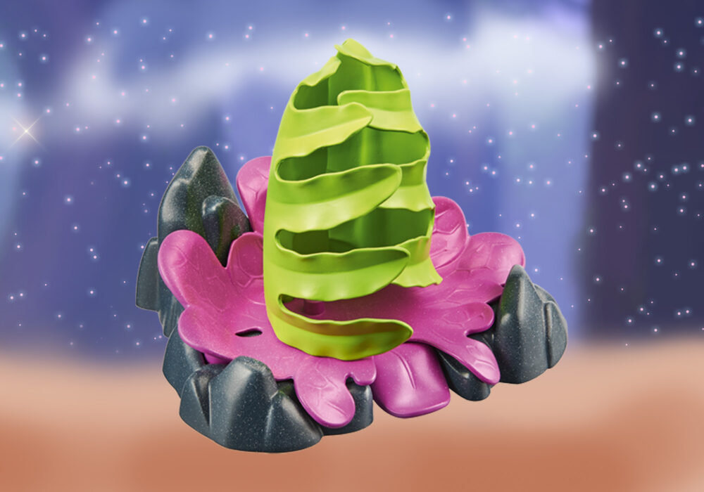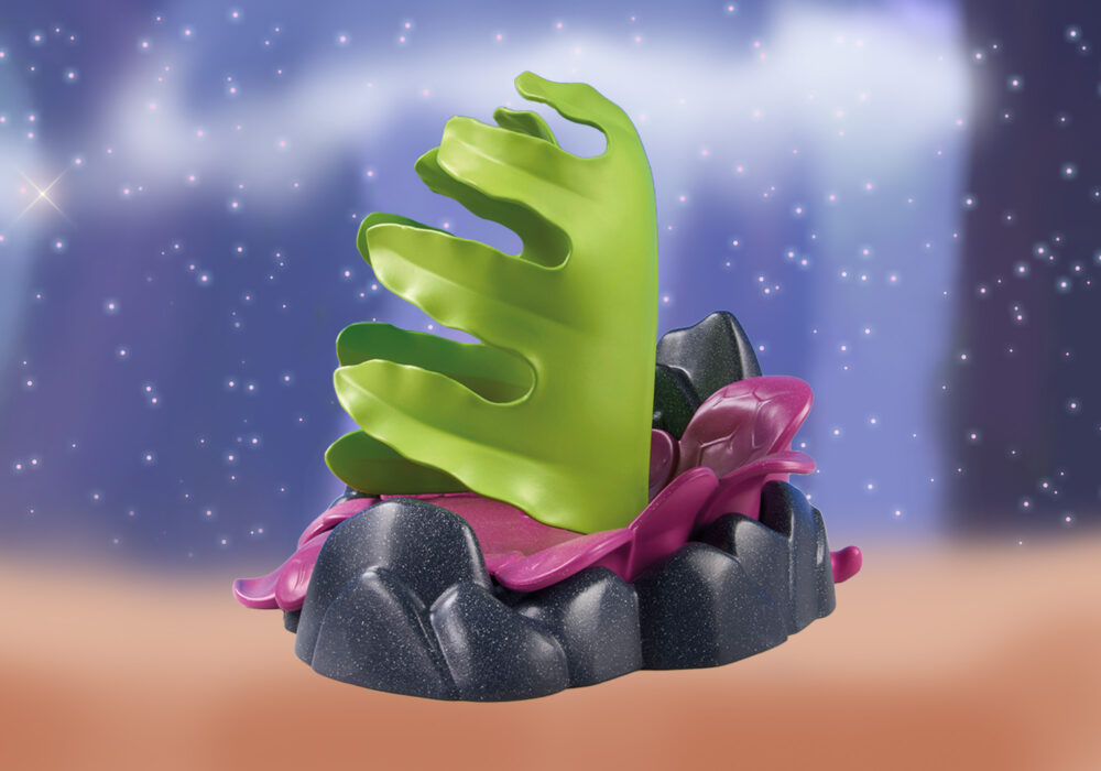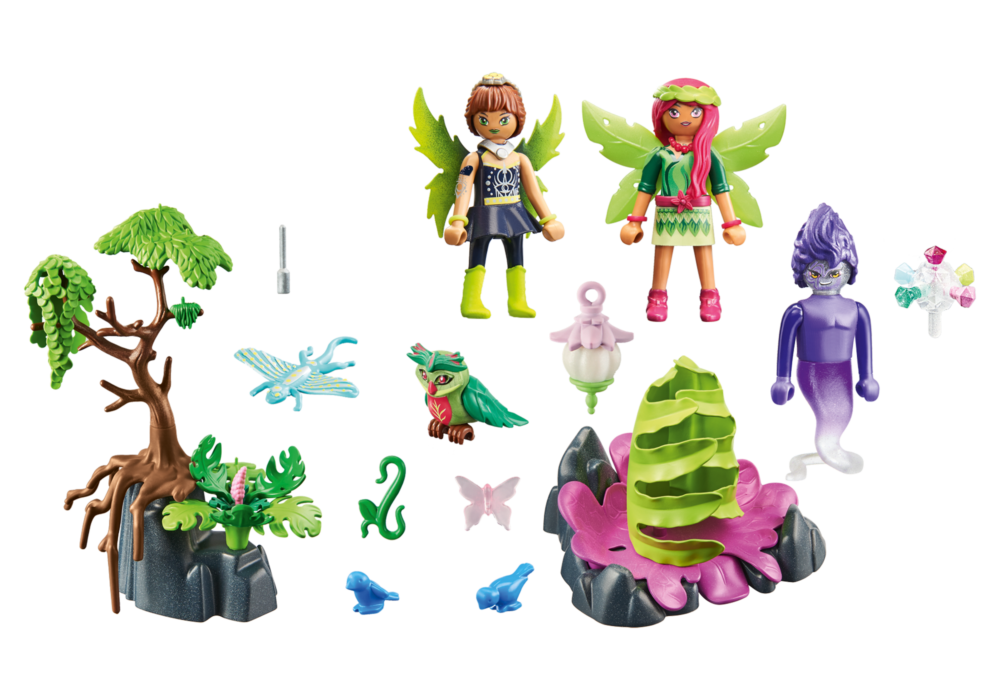 ของเล่นนางฟ้า 47 ส่วนประกอบด้วยฟิกเกอร์ PLAYMOBIL สามตัว สัตว์วิญญาณสองตัว จิ้งจกบินและนกฮูก กับดักหมอกที่มีใบไม้เคลื่อนไหว ต้นไม้ที่มีดอกไม้วิเศษและตะเกียง รวมถึงสิ่งพิเศษที่น่ารักอื่นๆ Moon Fairy Starmia มีใบหน้าอื่น สามารถถอดเครื่องประดับศีรษะ สร้อยข้อมือ สร้อยคอ และกระโปรงซิลิโคนได้ โคมไฟดอกไม้เรืองแสงในที่มืด