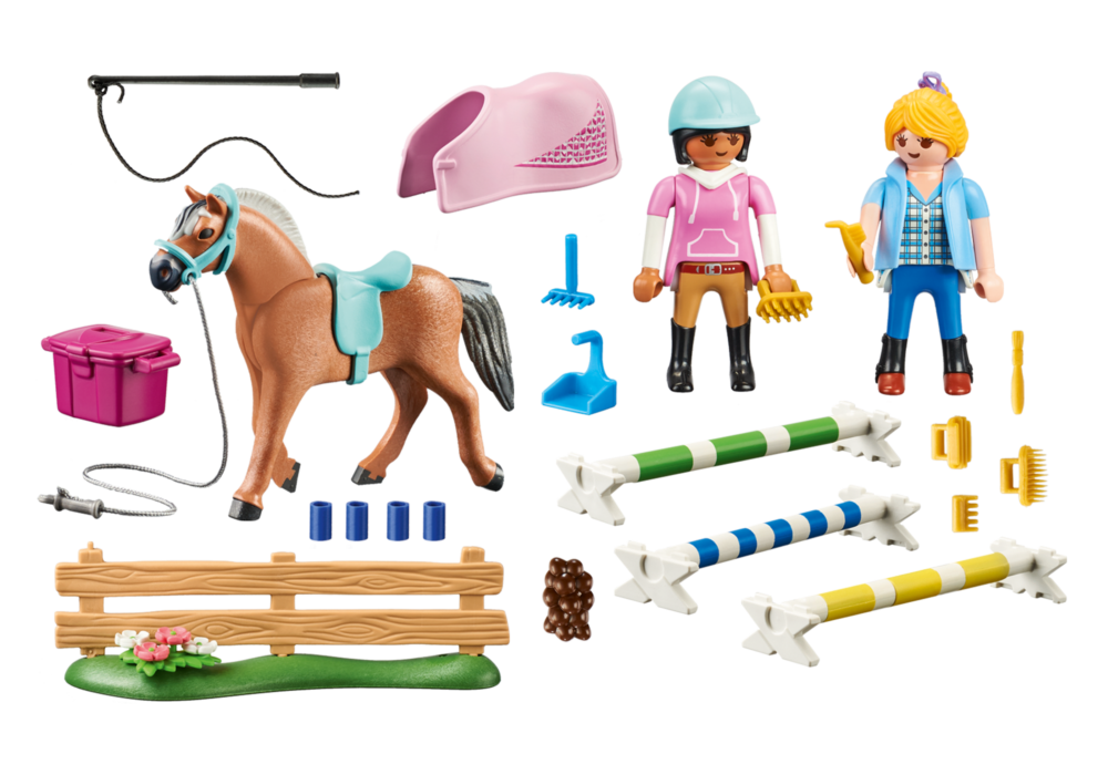 มีความสนุกที่ยอดเยี่ยมสำหรับแฟน ๆ ม้าด้วยชุดบทเรียนการขี่ PLAYMOBIL ที่ยอดเยี่ยม การฝึกสอนการขี่ม้าแสดงการกระโดดกับลูกศิษย์ของเธอบนสนามฝึก ในการทำเช่นนี้ เสาสามต้นจะซ้อนทับกันเพื่อสร้างแท่นกระโดด ผู้ขับขี่เข้าใกล้สิ่งกีดขวางด้วยความระมัดระวังบนหลังม้าของเธอและกระโดดข้ามสิ่งกีดขวางอย่างง่ายดาย ชุดม้าสีสันสดใสนี้ประกอบด้วยฟิกเกอร์มินิตุ๊กตาสองตัว ม้าของเล่น รั้ว เครื่องกีดขวางกระโดด และอุปกรณ์ขี่ม้ามากมาย ม้าสามารถติดตั้งเชือกแขวนคอ อาน ผ้าพันแผล และผ้ารองอานม้า ของขวัญวันเกิดหรือของที่ระลึกที่ดีสำหรับลูกรักม้าอายุ 4 ปีขึ้นไป