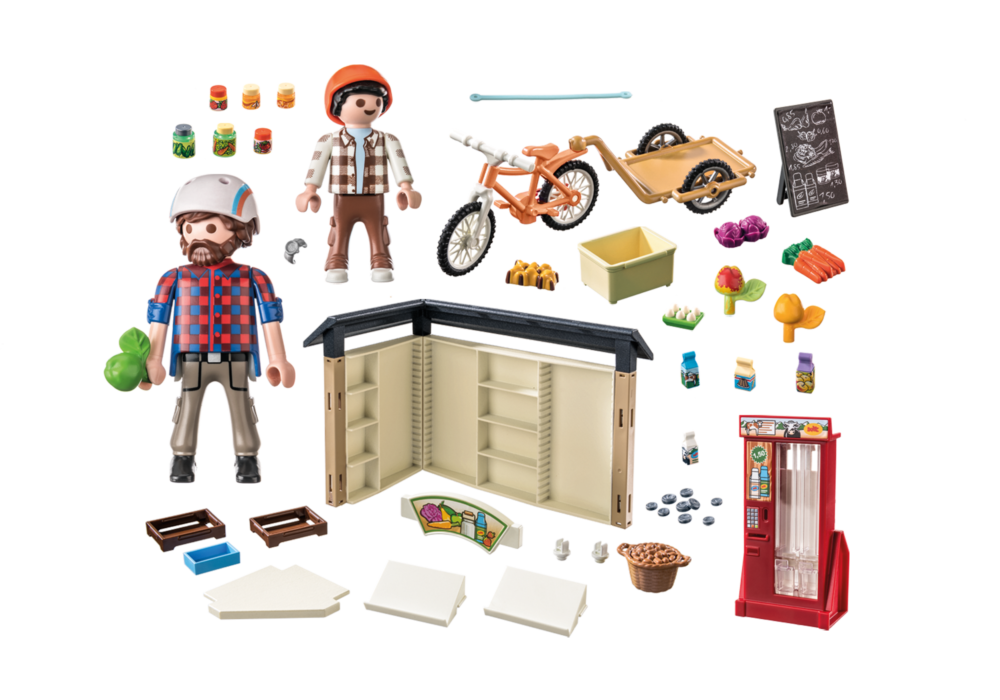 • ชุดของเล่น PLAYMOBIL 83 ชิ้น ประกอบด้วยฟิกเกอร์ PLAYMOBIL สองตัว ร้านค้าฟาร์มที่มีเครื่องจำหน่ายนม ไข่ ผลไม้ ผัก และอาหารอื่นๆ อีกมากมาย